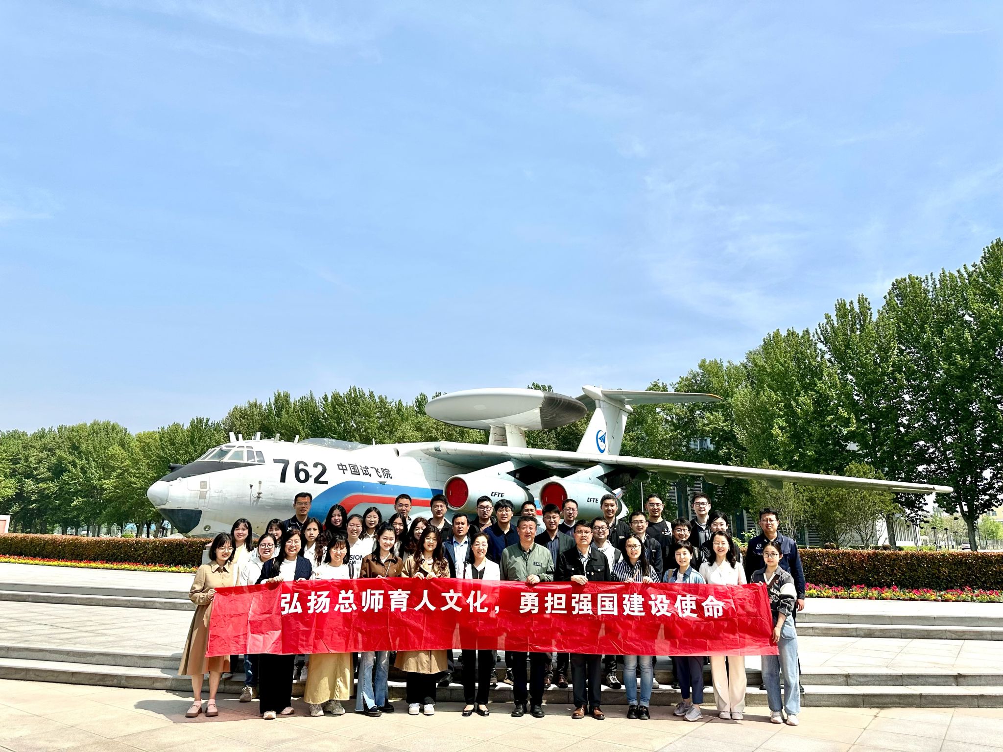 To further promote the Chief Engineer Culture of Educating People, foster patriotism among teachers and students, and inherit and carry forward the glorious traditions and fine conduct of the Party, the School of Management organized more than 40 teachers and students to visit and exchange ideas at the China Flight Test Establishment (CFTE) on April 18. Zhang Shuang, Secretary of the Party Committee of the School, Wang Haixiao, Deputy Secretary, as well as young teachers and student representatives participated in the event.
