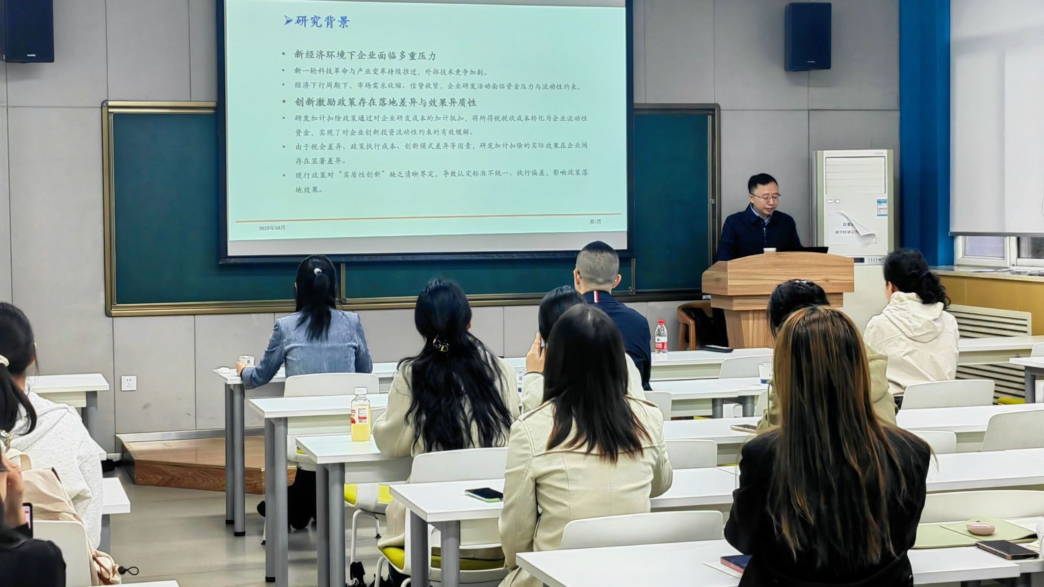 On the morning of October 11th, at the invitation of the School of Management, Professor Zhu Jigao from the University of International Business and Economics delivered an academic lecture titled "The Spillover Effects of Innovation Cost Sharing: Research on the Impact of the R&D Expense Deduction Policy on the Labor Income Share" in the 214 Lecture Hall of the School Building on the Chang'an Campus. The lecture was hosted by Associate Professor Tian Haowen from the School of Management, and was attended by teachers and students from the school.