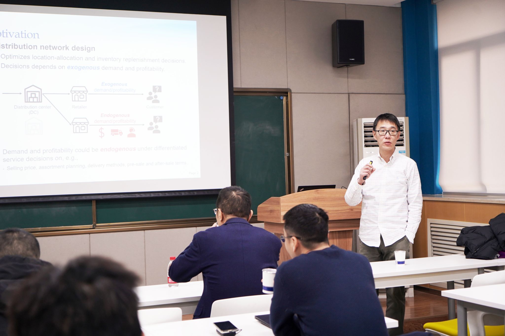The talk was exceptionally well-structured and logically rigorous. Professor Shu began with the research background, highlighting the critical role of service mode selection in supply network design. He then detailed the model formulation and its key assumptions, followed by a step-by-step derivation and explanation of the theoretical findings and their implications.