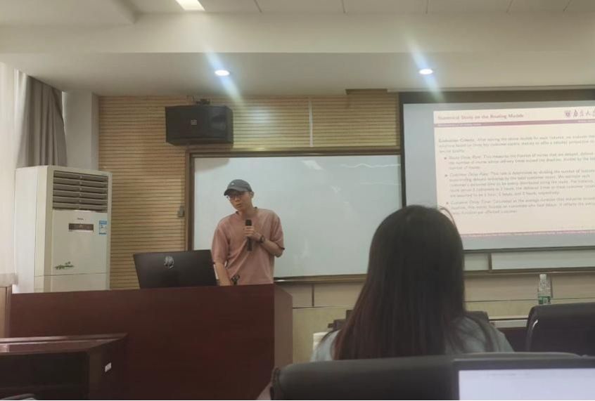 Professor Luo Zhixing first introduced the composition of his research team and the latest research progress. He then shared the ongoing research on urban distribution routing planning, briefly elaborated on its background, and pointed out that the core focus of this issue lies in time. Faced with the uncertainty of delivery time and the problem of personal privacy protection, he decided to adopt a mathematical model combined with multiple characteristic values (such as delivery quantity, couriers’ historical delivery routes, etc.) to fit the delivery time. Furthermore, he constructed a deterministic linear programming model based on this mathematical model and solved it using the Benders algorithm. Finally, he demonstrated the advantages of the applied method through multi-dimensional comparisons.