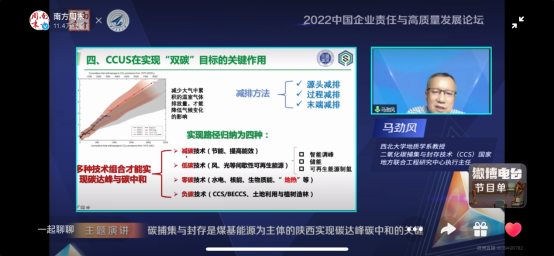 Fan Ying, Dean of the School of Economics and Management at Beihang University and Director of the Low-Carbon Governance and Policy Intelligence Laboratory of Beihang University, delivered a keynote speech entitled Energy Transition Toward Carbon Neutrality, which illustrated the broad market space for various types of clean energy under the vision of carbon neutrality. Ma Jingfeng, Professor of the Department of Geology at Northwest University and Executive Director of the National & Local Joint Engineering Research Center for Carbon Dioxide Capture and Storage (CCS) Technology, presented a report titled Carbon Capture and Storage: The Key to Carbon Peaking and Carbon Neutrality in Shaanxi with Coal-based Energy as the Mainstay. He shared the effective application of carbon dioxide capture and storage technology in reducing carbon dioxide emissions into the atmosphere, as well as how big data analysis can support carbon peaking and carbon neutrality goals, delivering a presentation rich in academic insights and practical content. Wu Jian, Deputy Director of the Technology and Digitalization Department of State Grid Shaanxi Electric Power Company, shared the report Innovatively Fulfilling Environmental Missions and Demonstrating the Responsibility of Central Enterprises, elaborating on how central enterprises fulfill their social responsibilities to facilitate green development in detail.
