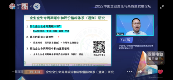 Mr. Wang Hongtao, Director of the Committee for Lifecycle Green Management of the China Electronic Energy Conservation Technology Association, gave a presentation on Research on the Corporate Carbon Neutrality Evaluation Index System (General Principles). Meanwhile, this is also one of the achievements of the "Corporate Lifecycle Carbon Neutrality Survey and Evaluation" project jointly initiated by the China Corporate Social Responsibility Research Center of Southern Metropolis Weekly and the Committee for Lifecycle Green Management of the China Electronic Energy Conservation Technology Association.