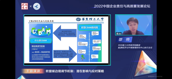 In the afternoon, Professor Shao Shuai, Professor at the Business School of East China University of Science and Technology and Executive Director of the Research Center for Energy Economics and Environmental Management, delivered an internationally perspective observation titled The EU Carbon Border Adjustment Mechanism: Potential Impacts and Response Strategies. It provided a brand-new perspective for discussions on the realization of the "dual carbon" goals, and offered a high-quality reference starting from the field of overcapacity governance.