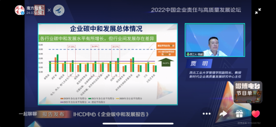 Jia Ming, Professor and Vice Dean of the School of Management of Northwestern Polytechnical University, and Director of the Research Center for High-Quality Development of Enterprises in the New Era, released the Corporate Carbon Neutrality Development Report. The report presented the first-phase corporate carbon neutrality development evaluation index system and evaluation results (2020–2021), aiming to explore the progress of corporate carbon neutrality development in China and put forward corresponding countermeasures and suggestions for promoting standardized corporate carbon neutrality management. This marks the first report in China focusing on the research of corporate carbon neutrality management and development paths.