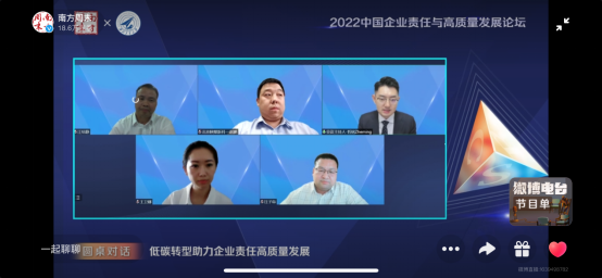Finally, the forum invited Zhao Peng (Director of the Planning and Development Department, Director of the Dual Carbon Business Department, and Secretary of the Party Branch of Beijing Shaanxi Coal New Energy Technology Co., Ltd., Shaanxi Coal Industry New Energy Technology Co., Ltd.), Jiang Shaojing (Director of the Recovery Efficiency Institute, Research Institute of Shaanxi Yanchang Petroleum (Group) Co., Ltd., Professor-level Senior Engineer, and Doctoral Supervisor), Wang Weina (ESG and Sustainable Development Director of Tianqi Lithium Corporation), and Wang Zifu (Social Responsibility Manager of LONGi Green Energy Technology Co., Ltd.) to participate in the roundtable discussion, where they jointly explored how low-carbon transition can facilitate the high-quality development of corporate social responsibility.