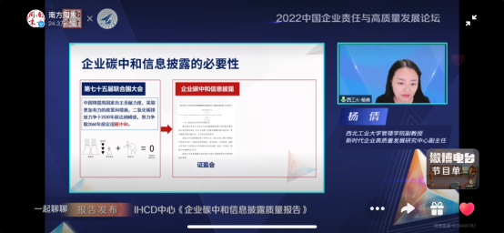 Yang Qian, Associate Professor of the School of Management of Northwestern Polytechnical University and Deputy Director of the Research Center for High-Quality Development of Enterprises in the New Era, released the Report on the Quality of Corporate Carbon Neutrality Information Disclosure. This is the first evaluation in China of the carbon information disclosure quality of listed companies included in the CSI 300 Index from the perspective of stakeholders.