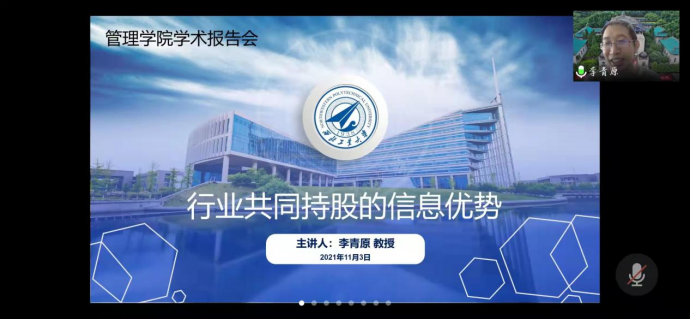 On the afternoon of November 3, 2021, at the invitation of the School of Management, Professor Li Qingyuan, Vice Dean of the School of Economics and Management, Wuhan University, delivered an online lecture entitled "Information Advantages of Industry Co-ownership" to teachers and students of the School of Management. The lecture was hosted by Professor Chen Lin.