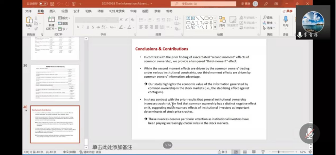 In the lecture, Professor Li Qingyuan first elaborated that the information advantages of institutional investors within the same industry enable them to distinguish between positive and negative industry-specific and firm-specific news, avoid being misled by false information into panicking and withdrawing investments, and thereby reduce the risk of stock price crashes. Subsequently, Professor Li emphasized the economic value of common owners in the stock market and the stabilizing effect brought by their information advantages, drawing on his own research. After the research sharing, Professor Li conducted in-depth online exchanges with teachers and students, sharing his experience in publishing papers in top Chinese and English academic journals.
