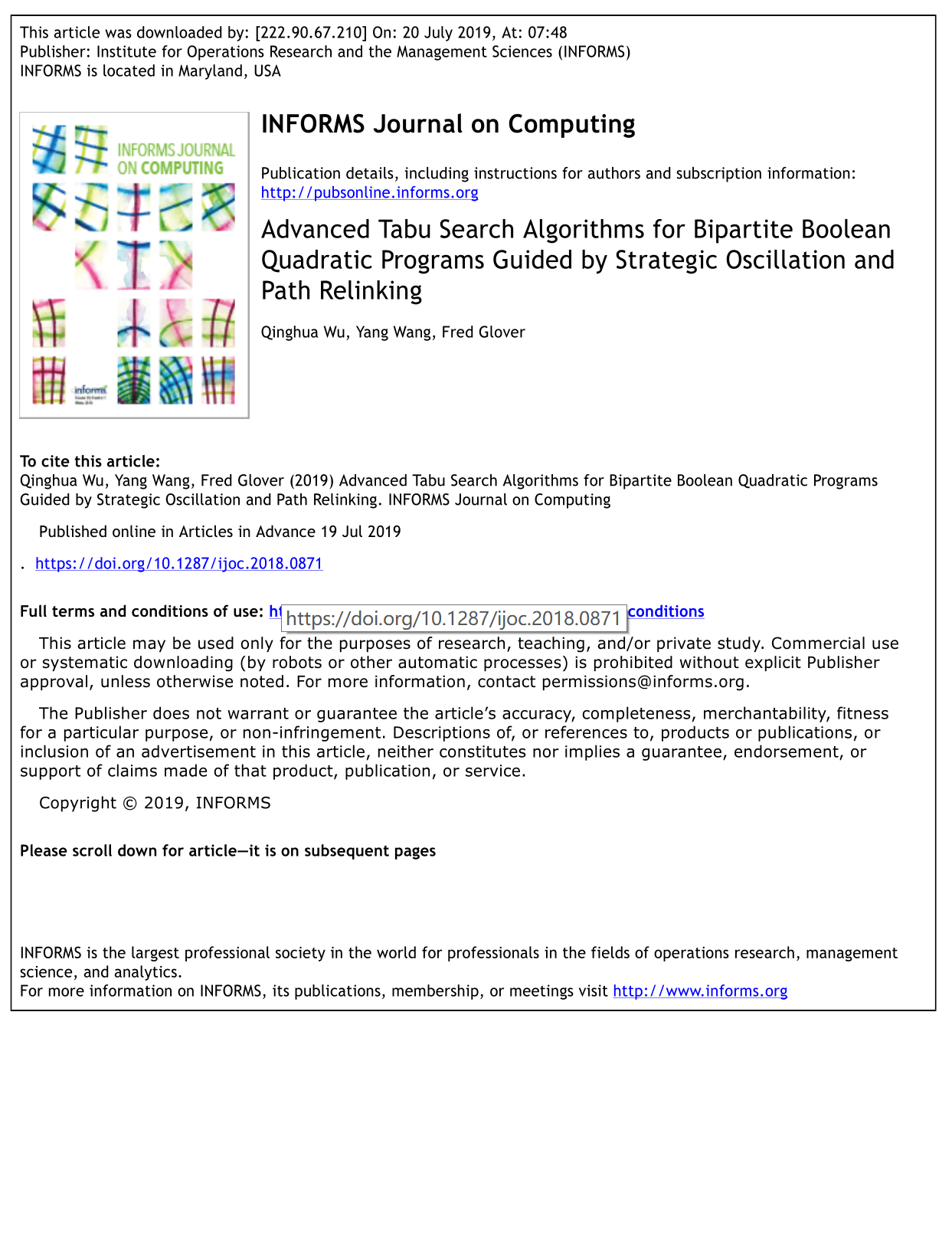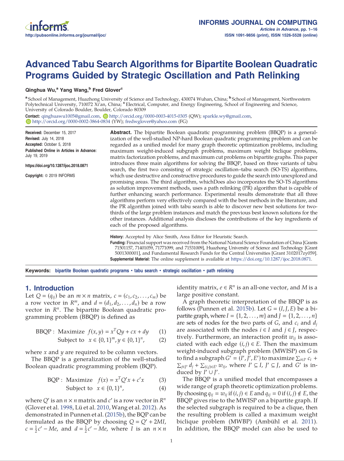 Recently, Associate Professor Wang Yang from the School of Management of our university, serving as the corresponding author, collaborated with Associate Professor Wu Qinghua from Huazhong University of Science and Technology and Dr. Fred Glover, Member of the U.S. National Academy of Engineering, to publish an academic paper titled Advanced Tabu Search Algorithms for Bipartite Boolean Quadratic Programs Guided by Strategic Oscillation and Path Relinking in INFORMS Journal on Computing—one of the world’s most prestigious academic publications included in the UTD Top 24 Business Journals list for the field of management.