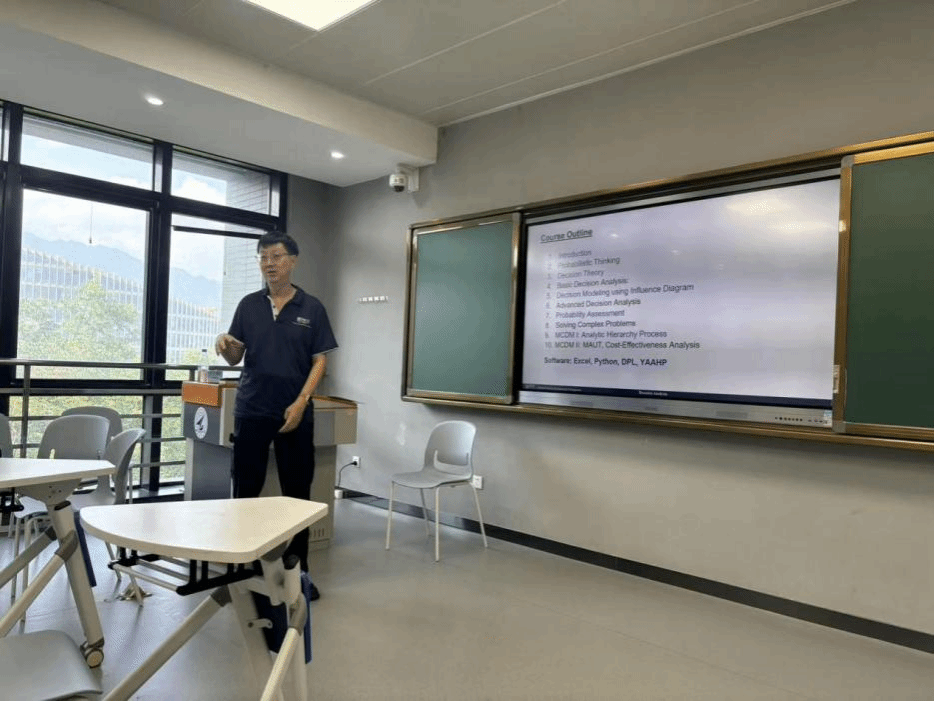 From June 23 to July 3, Professor Poh Kim Leng from the National University of Singapore taught Decision Analysis. The course covered core topics including decision trees, influence diagrams, utility functions, risk preference modeling, and the Analytic Hierarchy Process (AHP).