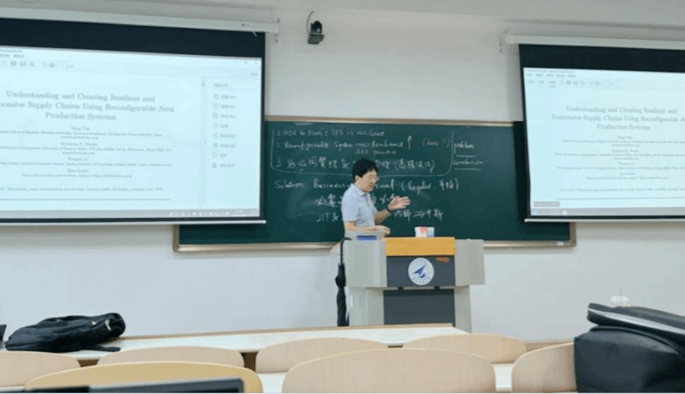 From June 23 to June 30, Professor Yin Yong from Doshisha University, Japan, offered the course Operations Management. Professor Yin introduced the connotation, objectives, classic theories of operations management and how to apply theories into practice. Taking the production systems of Ford and Toyota as backgrounds, he elaborated on lean production and the classic rule in operations management — Little’s Law: Inventory = Time × Rate — and its applications.