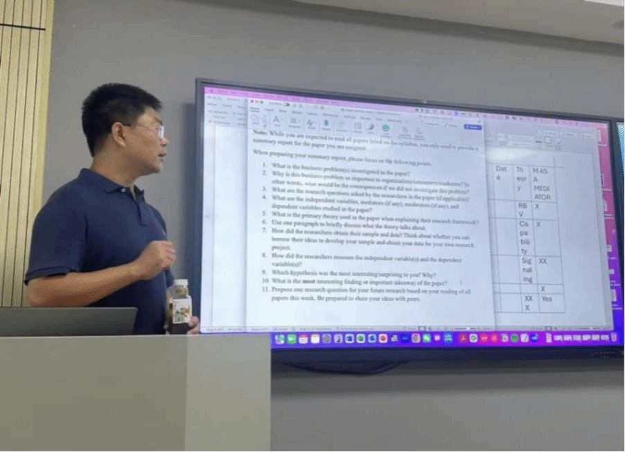 It covered research methodology for theory building, the nature of marketing and marketing strategy, transaction cost and agency theory, innovation and new product development, interdisciplinary research between marketing and finance, marketing and entrepreneurship, and other topics. Through paper sharing, presentations and group discussions, the course helped students systematically understand the basic framework of marketing strategy research and keep abreast of recent developments in the field.