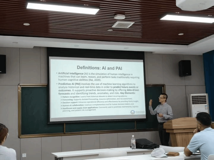 On the morning of May 29th, Professor Cao gave a lecture titled "Trustworthy AI: The Role of Transparency, Explainability, and Ethics in AI Adoption and Organizational Decision-Making". Based on trust theory, he constructed a research model and revealed the influence mechanism of trustworthy AI elements on AI adoption outcomes through empirical analysis of survey data from 300 enterprise managers in the UK. The following day, Professor Cao delivered a methodological sharing session titled "Tips for Writing a Research Paper for Publication". Drawing on his experience of publishing in top international journals, he systematically analyzed the core structure of academic papers, covering abstract refinement, introduction construction, literature review logic, hypothesis development, and discussion sections.