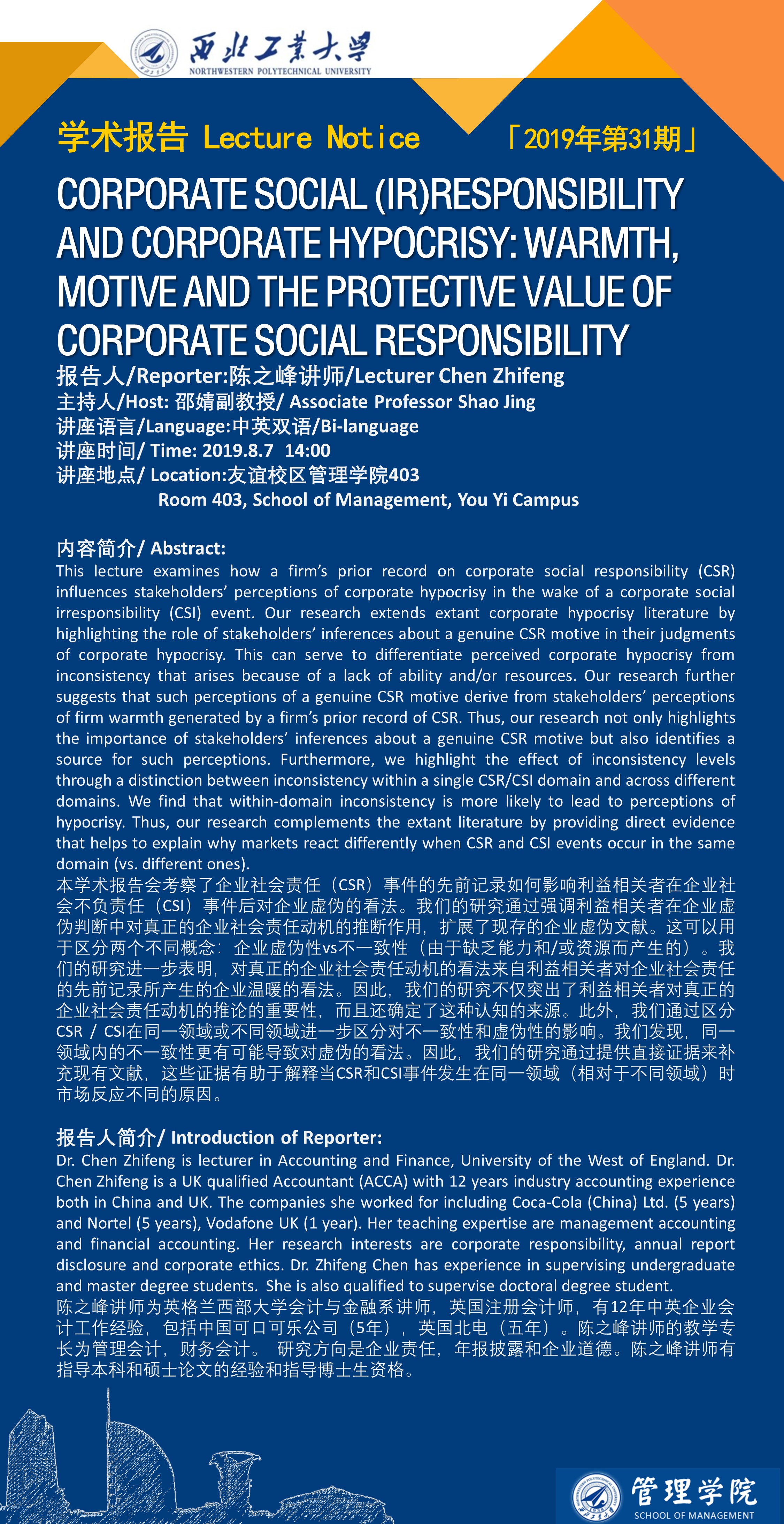 [Lecture Notice]CORPORATE SOCIAL (IR)RESPONSIBILITY AND CORPORATE HYPOCRISY: WARMTH, MOTIVE AND THE PROTECTIVE VALUE OF CORPORATE SOCIAL RESPONSIBILITY