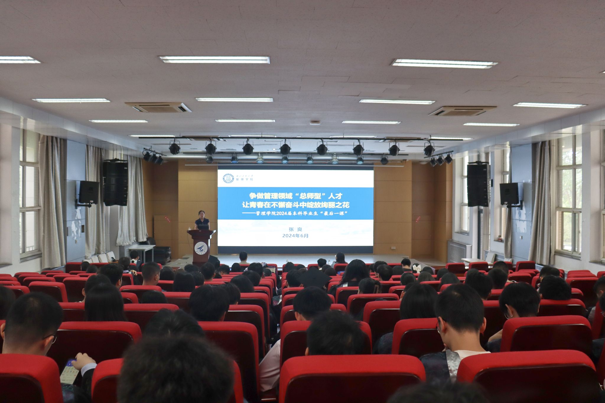On the afternoon of June 19, Zhang Shuang, Secretary of the Party Committee of the School of Management, delivered the "Last Lecture" to the 2024 undergraduate graduates, themed "Striving to Be 'Chief Engineer-Type' Talents in the Management Field, Letting Youth Bloom Brilliantly Through Unremitting Struggle". The event was presided over by Wang Haixiao, Deputy Secretary of the Party Committee of the School. Bai Jie, Assistant to the Dean, counselors of the graduating class, and all undergraduate graduates attended the event.