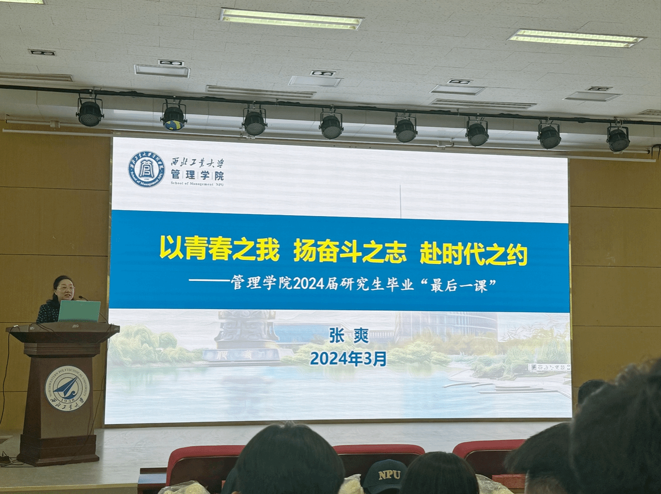 To effectively carry out the graduation education for the 2024 graduates, on the afternoon of March 28, Zhang Shuang, Secretary of the Party Committee of the School of Management, delivered the "Last Lesson at NPU" to all 2024 master’s graduates, themed "With Youthful Vigor, Uphold Aspirations of Struggle, and Answer the Call of the Times". The lecture was presided over by Wang Haixiao, Deputy Secretary of the Party Committee of the School.