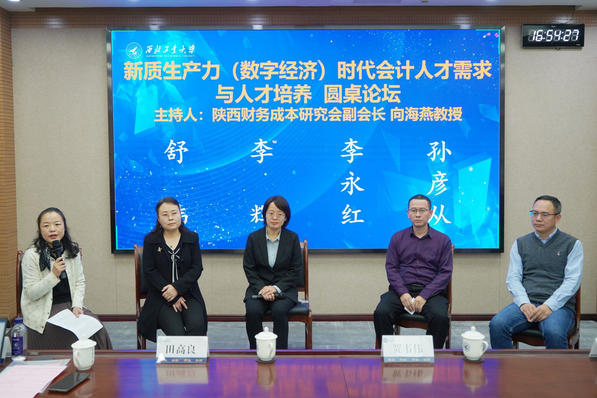 圆桌论坛环节由陕西财务成本研究会副会长向海燕教授主持,聚焦于新质生产力(数字经济)时代的会计人才需求与培养。论坛邀请了西安财经大学商学院副院长(主持工作)舒伟、西北大学经济管理学院副院长李辉、西安邮电大学经济与管理学院李永红教授以及中兴新云服务有限公司高级副总裁兼财务总监孙彦丛进行讨论,旨在为会计教育和职业发展提供新的思路与方向,为会计行业未来的人才培养提供指导。