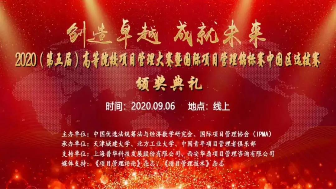 2020(第五届)高等院校项目管理大赛暨国际项目管理锦标赛中国赛区选拔赛,在防疫非常时期于2020年8月30日以线上方式成功举办,并于9月6日举行了云颁奖典礼。来自清华大学、北京大学、北京航空航天大学、西北工业大学、北京科技大学、华东理工大学、长安大学、北京邮电大学、江苏大学、上海大学等49所全国各地高校的103支代表队,400余名比赛学生参加了此次大赛。