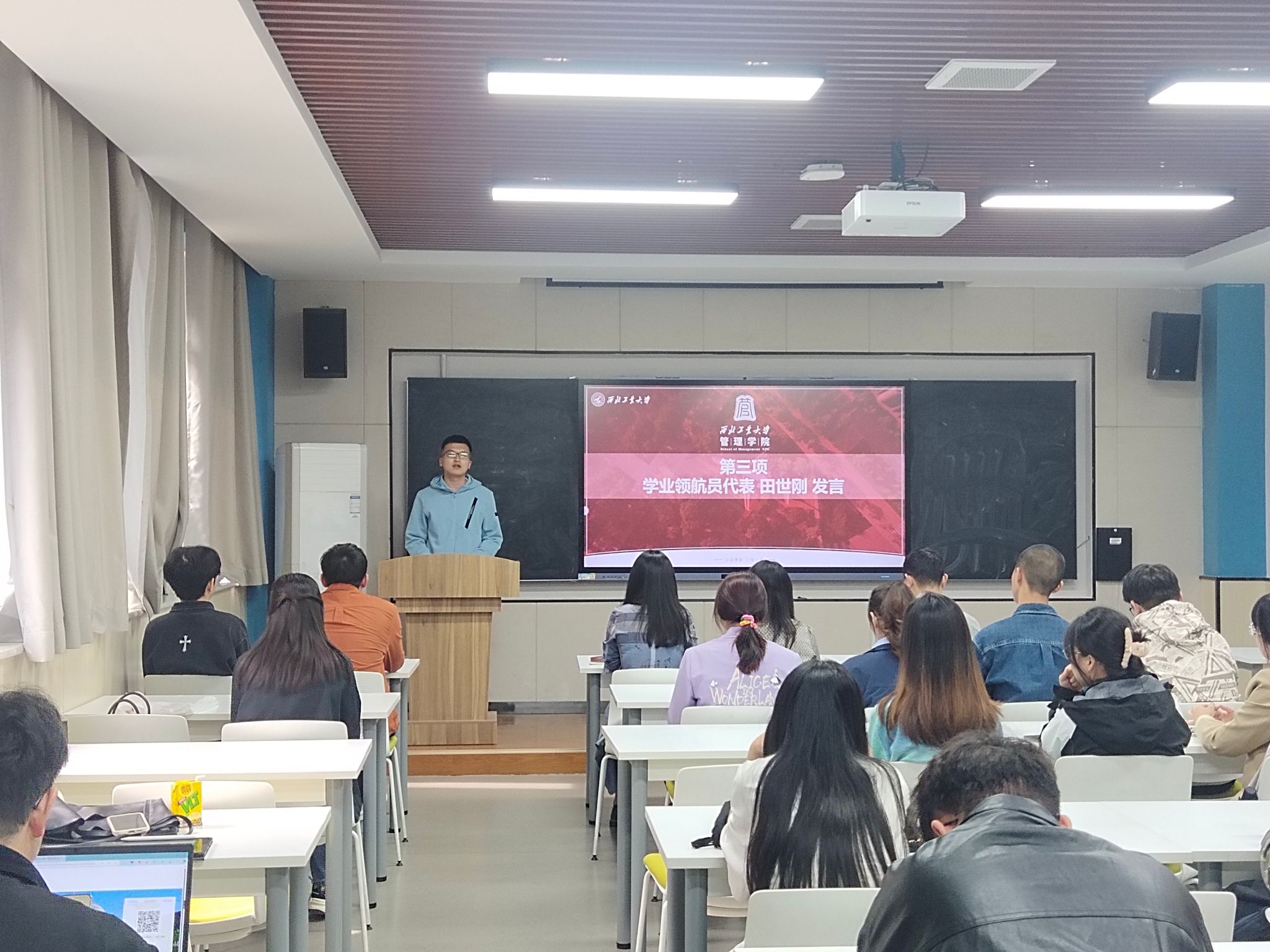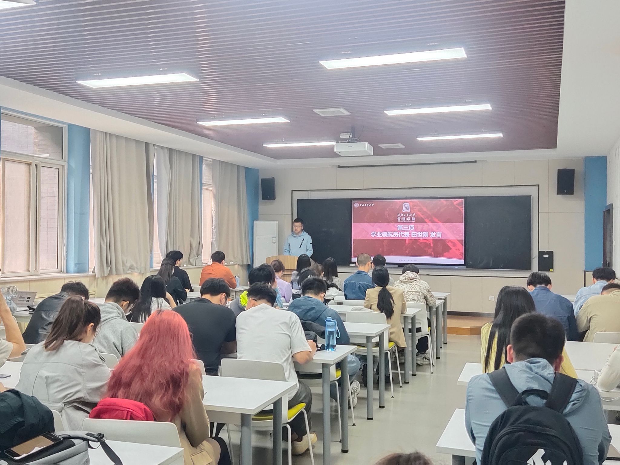 学业领航员代表田世刚同学分享了自己的考研心路历程,包括他两次考研的经历和最终成功考入管理学院的喜悦。他提到,自己曾在考研过程中渴望得到学长学姐的指引与帮助,现在他愿意成为学弟学妹们的灯塔,分享自己的考研经验,为他们排忧解难。