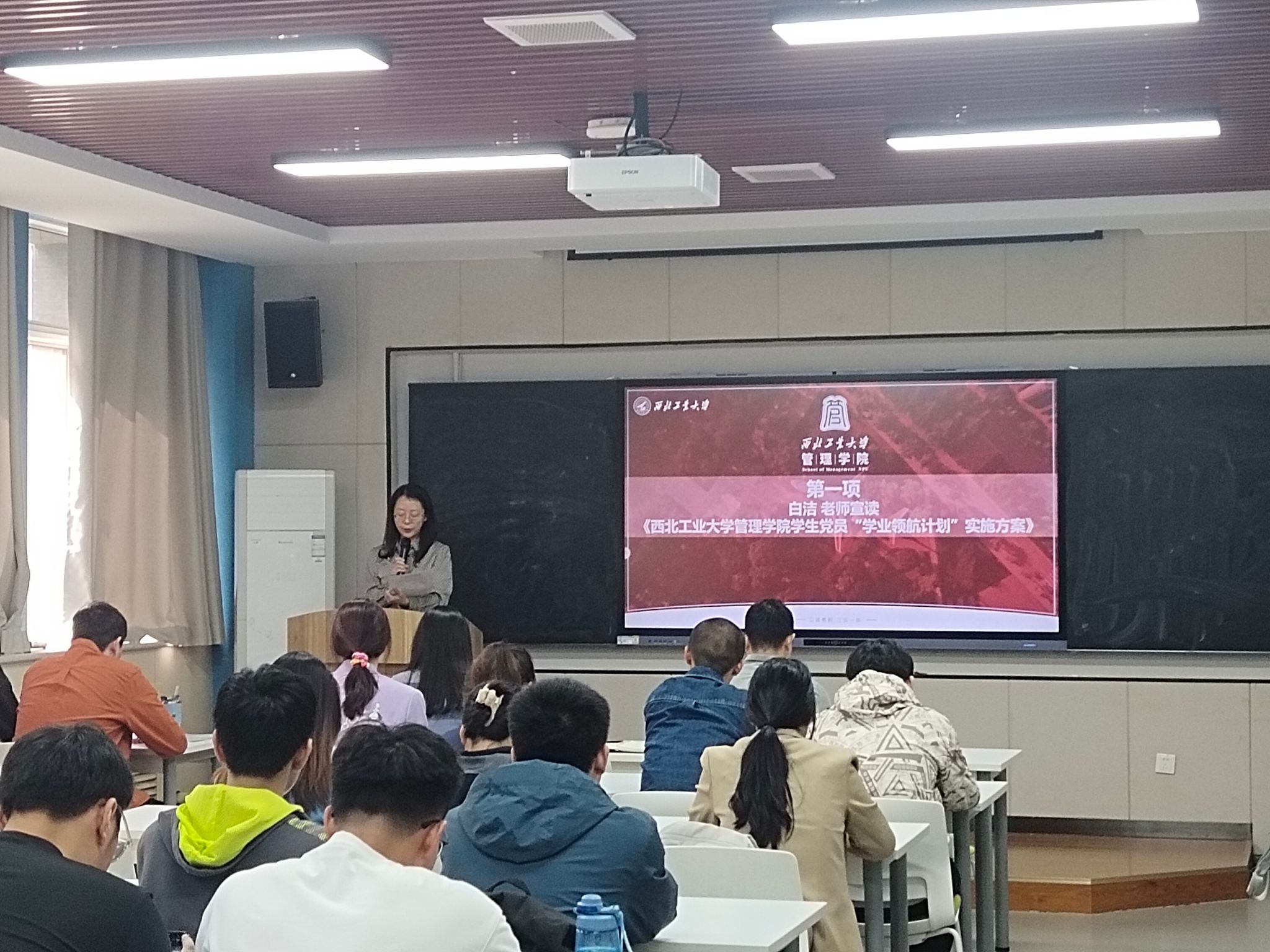 会上白洁宣读了《西北工业大学管理学院学生党员“学业领航计划”实施方案》,并详细介绍了计划的目标、内容和实施步骤,包括考研指导帮扶和课程答疑辅导等活动内容。