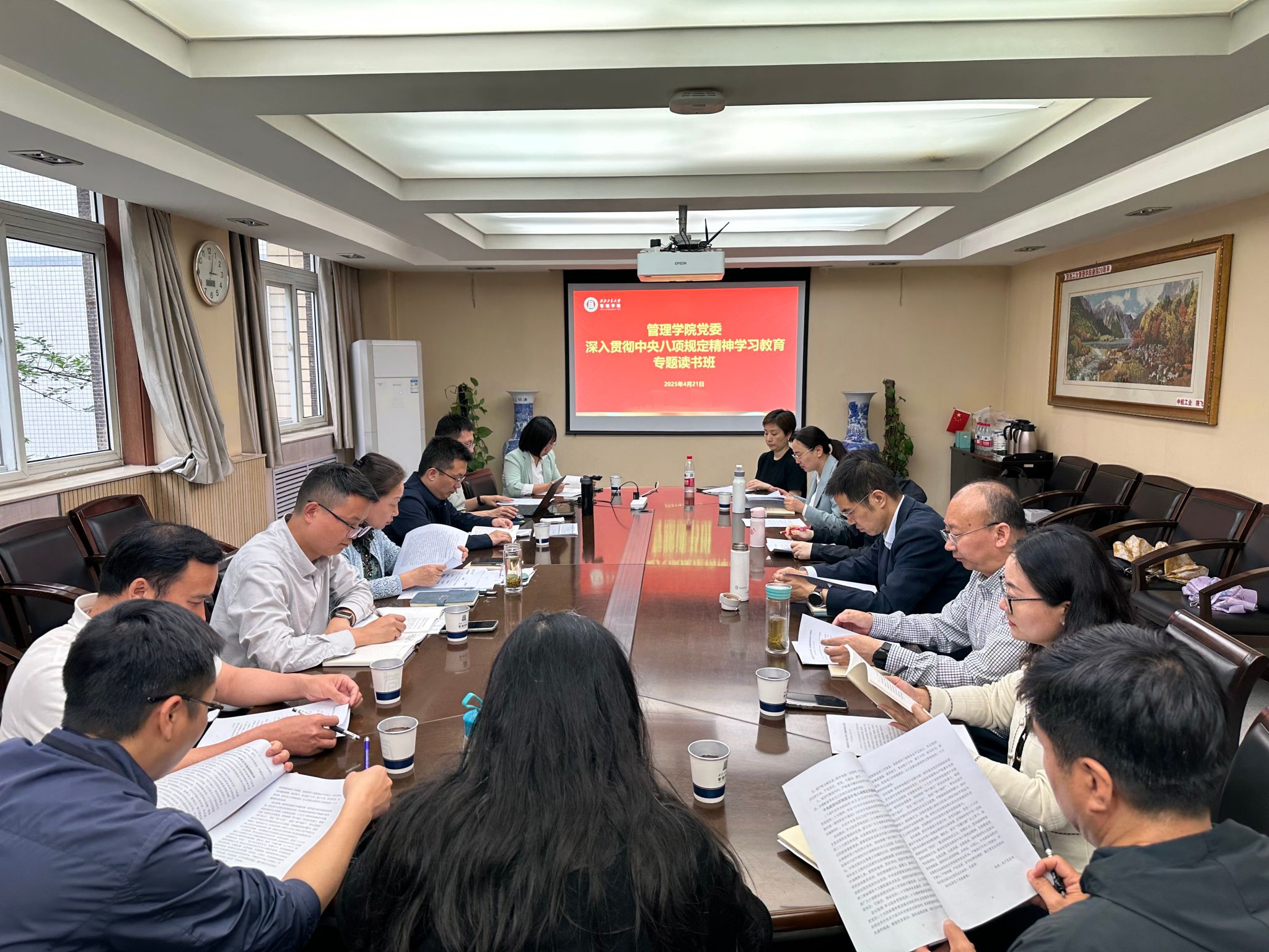 4月21日,管理学院党委举办深入贯彻中央八项规定精神学习教育读书班暨党委理论学习中心组(扩大)会。学院中心组成员、教工党支部书记、系主任参加会议。会议由学院党委书记张爽主持。