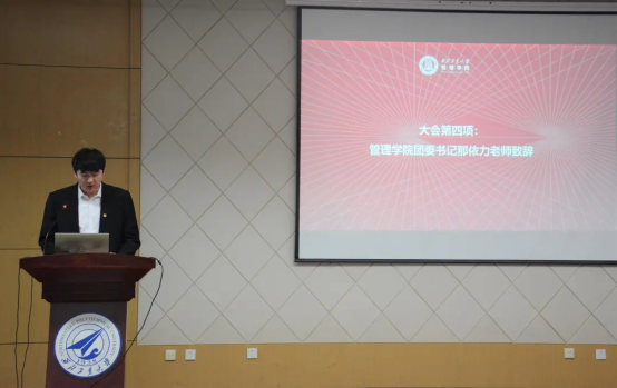 管理学院团委书记那依力老师致辞。那依力老师肯定了管理学院获得的荣誉,并讲到当代青年与新时代同向同行,处在中华民族发展的最好时期,既面临着难得的建功立业的人生际遇,也承载着伟大的时代使命,是实现中华民族伟大复兴的生力军。
