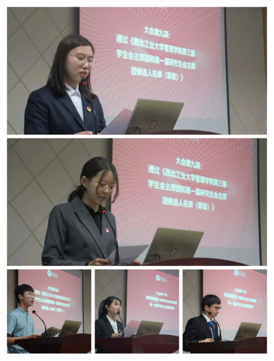 主持人宣布并由代表全票通过了西北工业大学管理学院第三次学生代表大会暨第一次研究生代表大会选举总监票人、总计票人、监票人、计票人,管理学院第三届学生会主席团和第一届研究生会主席团候选人成员名单。候选人依次进行了自我介绍,讲述了自己竞选主席团成员的原因以及优势。