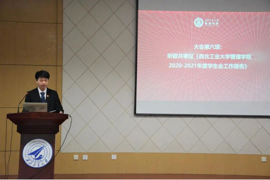 随后,管理学院第二届学生会主席团成员陈海峰同学进行了学生会工作报告。陈海峰对第一届学生会组建以来的工作做了汇报——不忘跟党初心,思想引领持续加强;全心全意服务同学,职能地位充分落实,权益工作持续推进。陈海峰也做了未来一年的工作展望——加强政治引领,团结同学投身强国伟业;抓好网络平台建设;发挥榜样引领作用;严格要求,持续推进改革;健全权益反馈沟通机制,发挥学生会在组织育人、实践育人、文化育人的显著优势,为实现中华民族伟大复兴中国梦贡献青春力量。