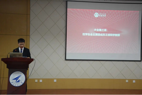 校学生会主席团成员王硕同学致辞。王硕同学讲到,管理学院学生会在思想引领、服务同学当好桥梁等方面做出了大量工作,善于自我反思、勇于自我革新,坚定不移增强自身建设。