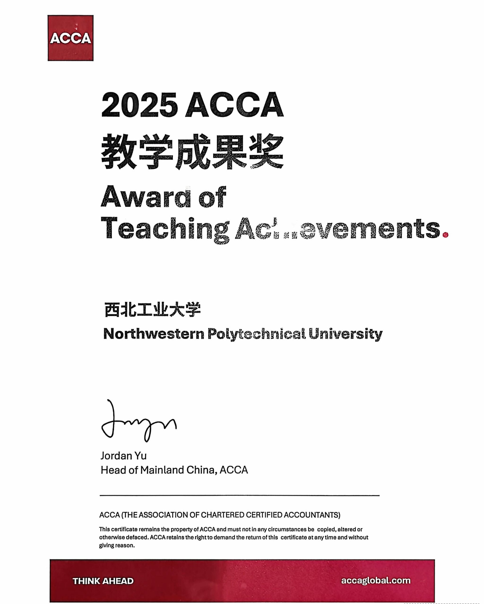Recently, the 16th ACCA National Education Forum hosted by the Association of Chartered Certified Accountants (ACCA) was held in Guangzhou, with the 2025 ACCA Authorised Partner Awards Ceremony held concurrently. The ACCA Programme at the School of Management, Northwestern Polytechnical University, was awarded the 2025 ACCA Teaching Achievement Award.