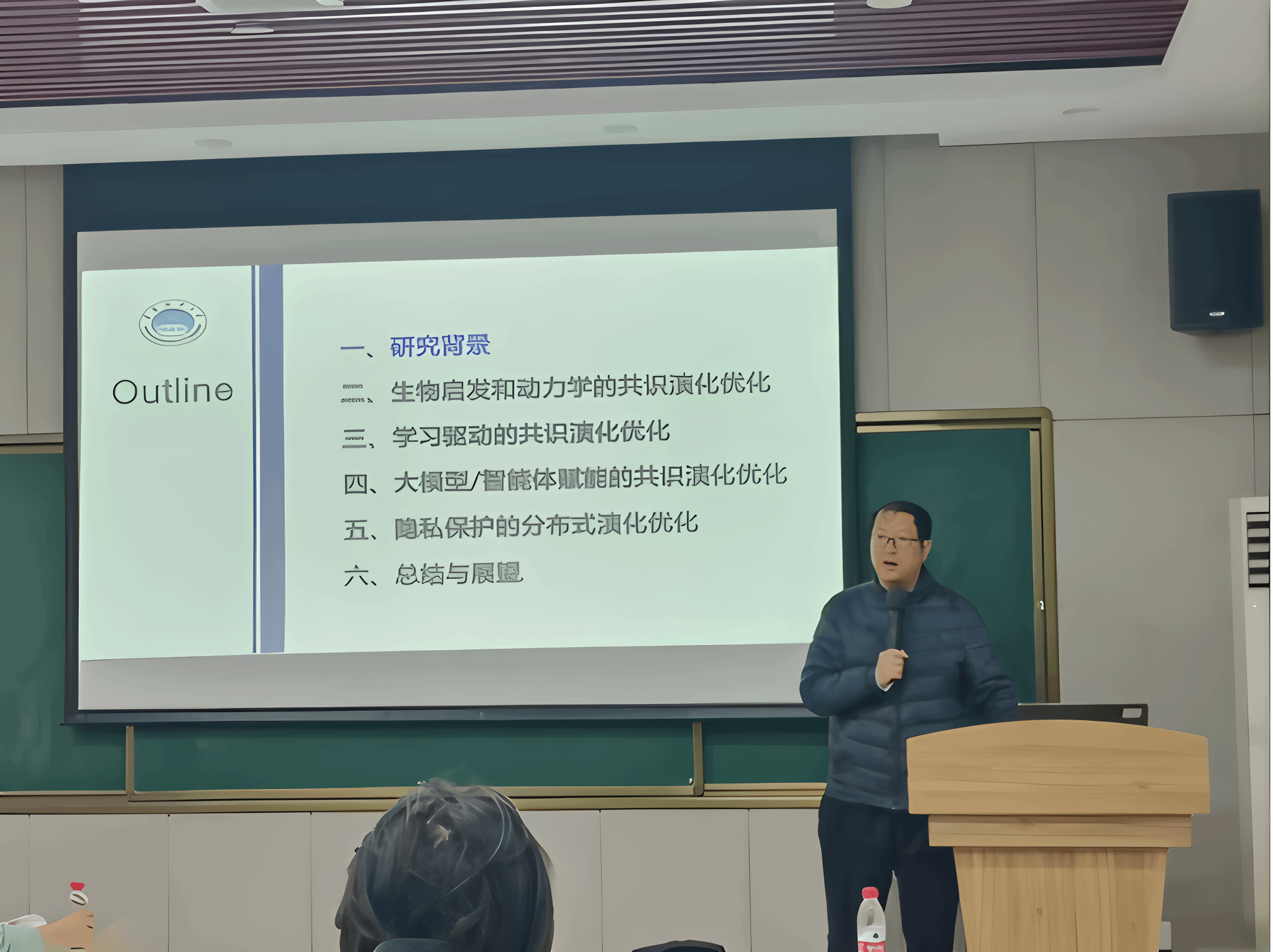 At the outset of the session, Professor Wang Yang briefly introduced Professor Chen Weineng’s professional background and research achievements, and the faculty and students of the School of Management extended a warm welcome to Professor Chen. In this lecture, Professor Chen elaborated on how to address the challenges faced by swarm intelligence decision-making and optimization in distributed environments against the backdrop of complex optimization scenarios such as non-convexity, black-box and high dimensionality that are prevalent in practical applications. First, he introduced biology-inspired and dynamics-based consensus evolutionary optimization, as well as learning-driven consensus evolutionary optimization, and elaborated on related research including multi-agent particle swarm optimization based on internal and external learning and reinforcement learning-aided consensus evolutionary optimization. Second, he presented consensus evolutionary optimization empowered by large models/intelligent agents and privacy-preserving distributed evolutionary optimization, showcasing to the faculty and students his research outcomes such as the autonomous design of Agent hyper-heuristic strategies for multi-role LLM collaboration and privacy-preserving genetic algorithms for combinatorial optimization. Finally, Professor Chen summarized and prospected the future development of distributed evolutionary computation.
