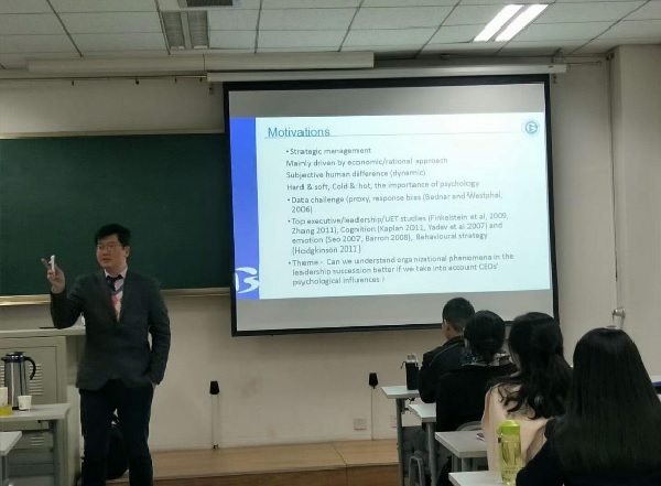 报告会前,郝老师简要介绍了黄庆安教授的学术背景和主要研究方向。随后黄庆安教授为大家讲解了在心理学、行为学和管理学相结合的领域中,非介入式研究方法的应用。黄教授重点讲解了自己的两项研究:CEO的情感和行为倾向对CEO离职方式的影响;以及CEO的措辞对企业业绩的影响。