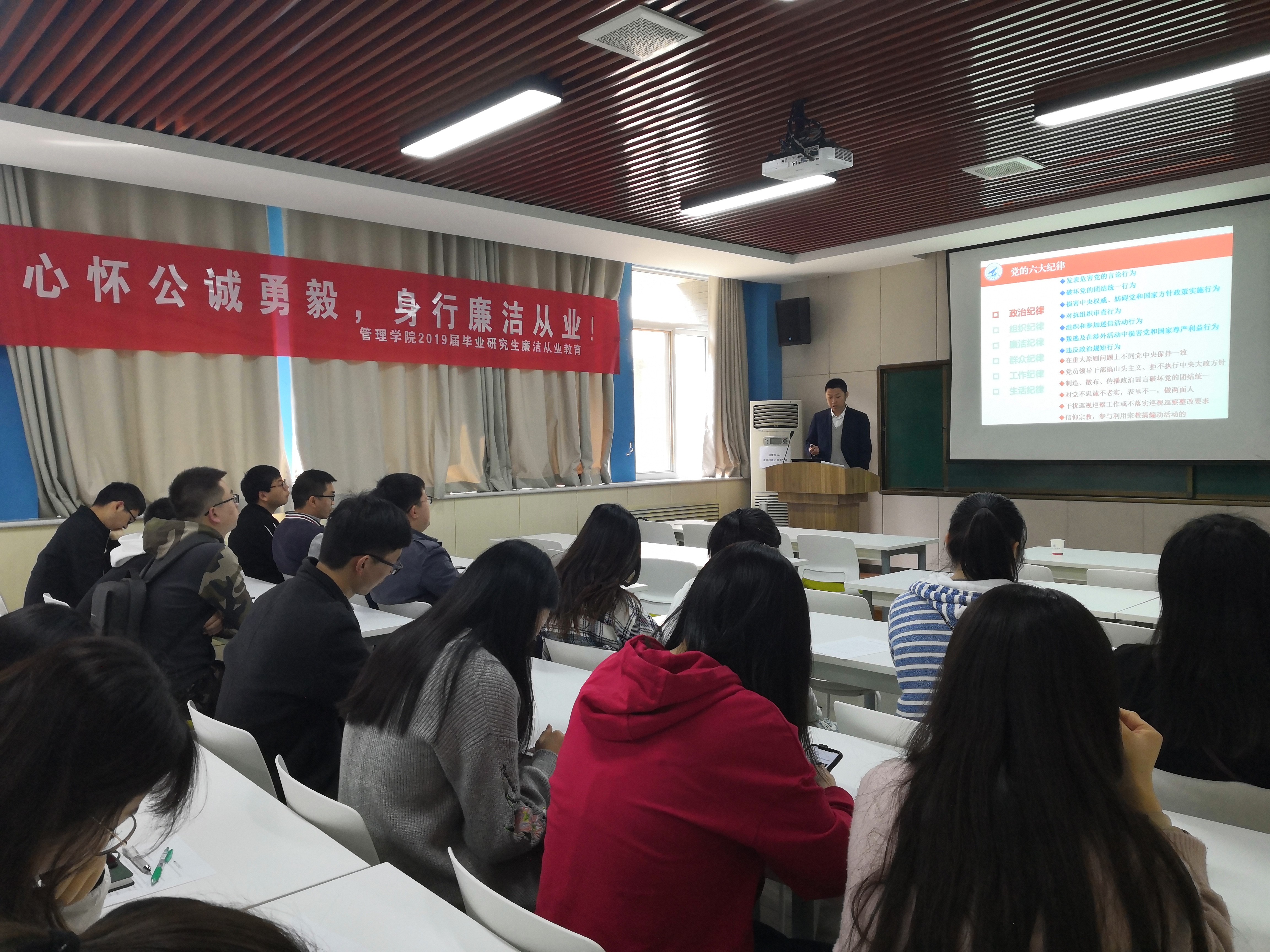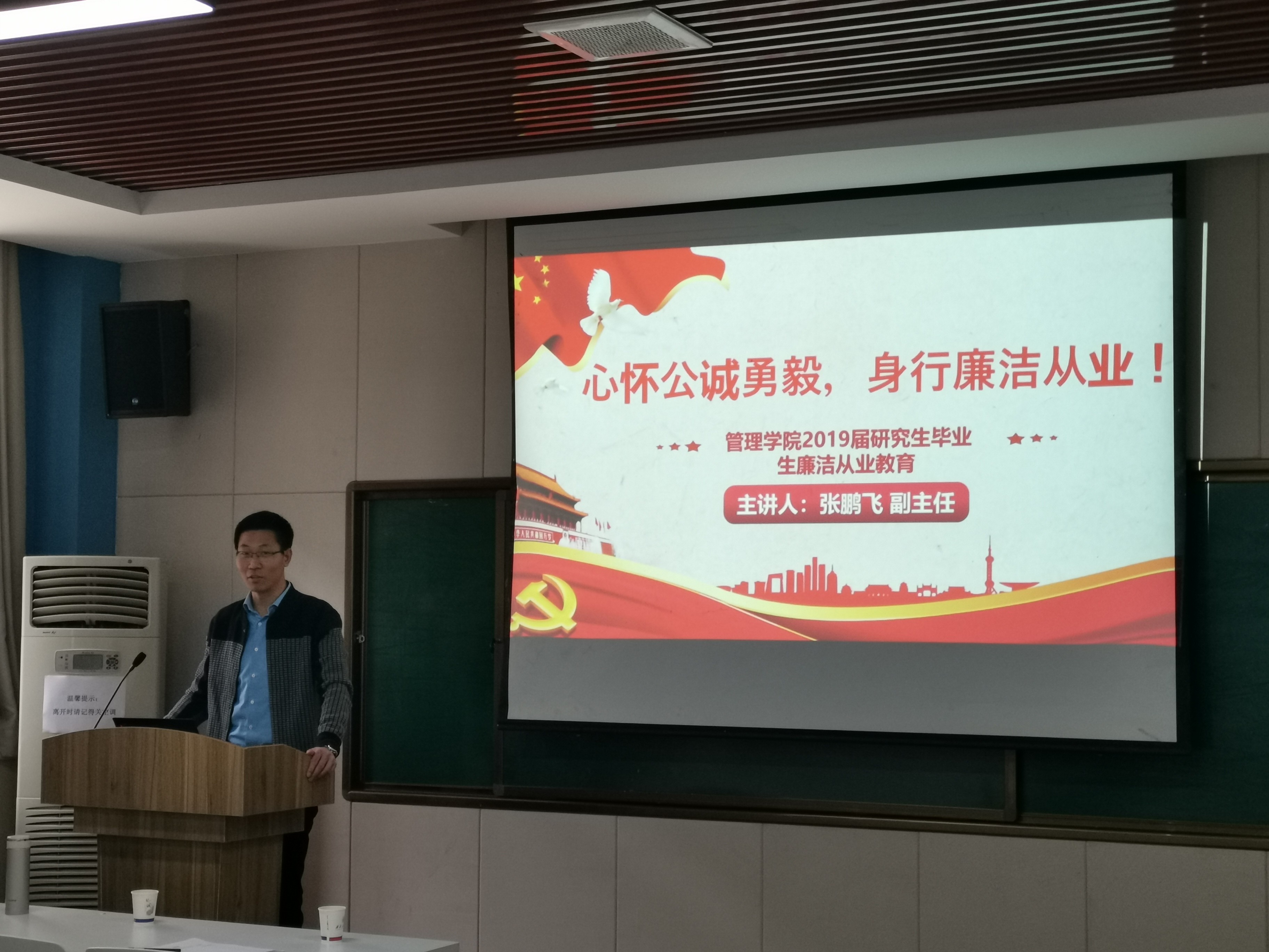为引导研究生加强廉政修养、增强纪律观念和组织观念,2019年4月1日上午,管理学院2019届毕业研究生廉洁从业教育活动在长安校区管理学院210顺利举行。本次活动邀请了纪委办副主任、监察处副处长张鹏飞,为2019届毕业研究生做专题教育。管理学院党委副书记曹子尧,研究生辅导员薛力及管理学院2019届全体毕业研究生参加了此次教育大会,会议由党委副书记曹子尧主持。
