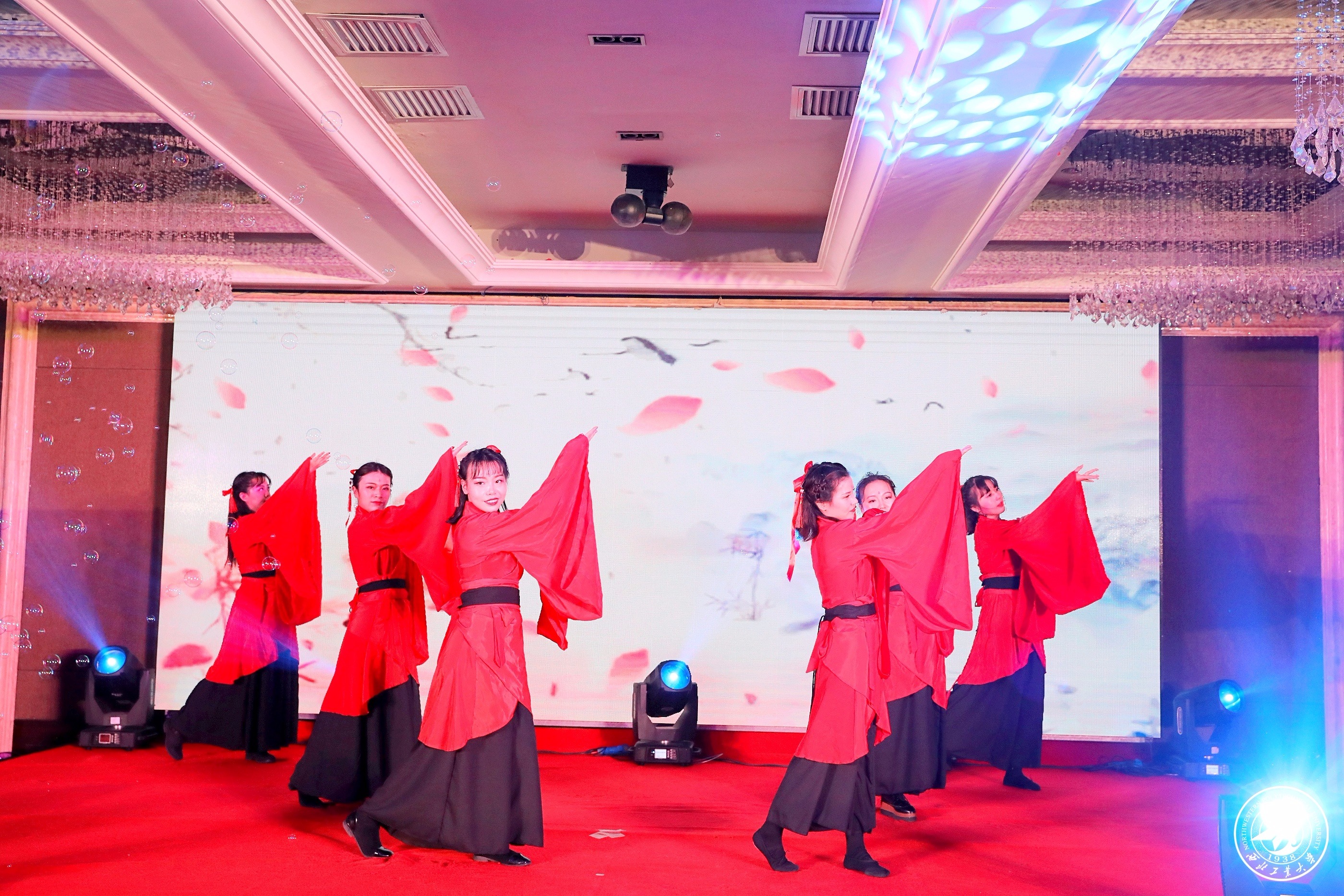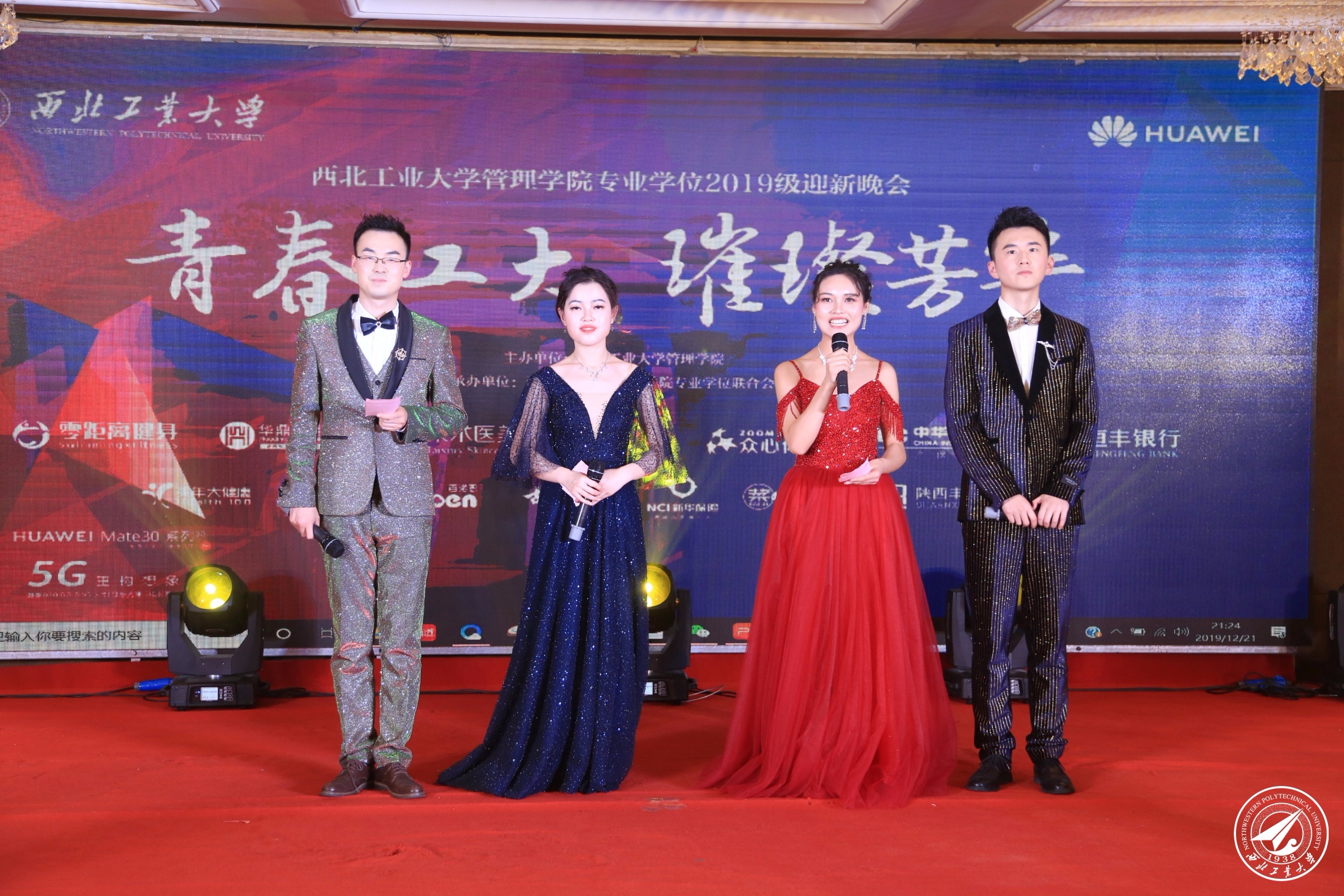 华服盛装,美乐妙曲,晚会完全由新生自编、自导、自演,历时两个月,以凌厉磅礴的气势隆重呈现。“时光如梭,聚焦今朝,我们又站在了崭新的起点之上。青春澎湃,活力飞扬,我们迎来了又一年的青年才俊。我们的梦想在这里起航,扬帆西工大人的激情与理想。我们的青春在这里绽放,书写着管院的绚丽华章。” 4位2019级新生主持人的开场白充满了激情,洪亮的声音回荡在现场。