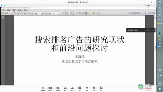 《管理理论专题》是我院为博士生开设的前沿课程,由学院10多位教师集体授课,轮流介绍自己所在领域的研究情况。4月16日下午,管理学院开展了《管理理论专题》系列报告第五讲,王清亮老师通过腾讯会议平台做了主题为“搜索排名广告的研究现状和前沿问题探讨”的报告。