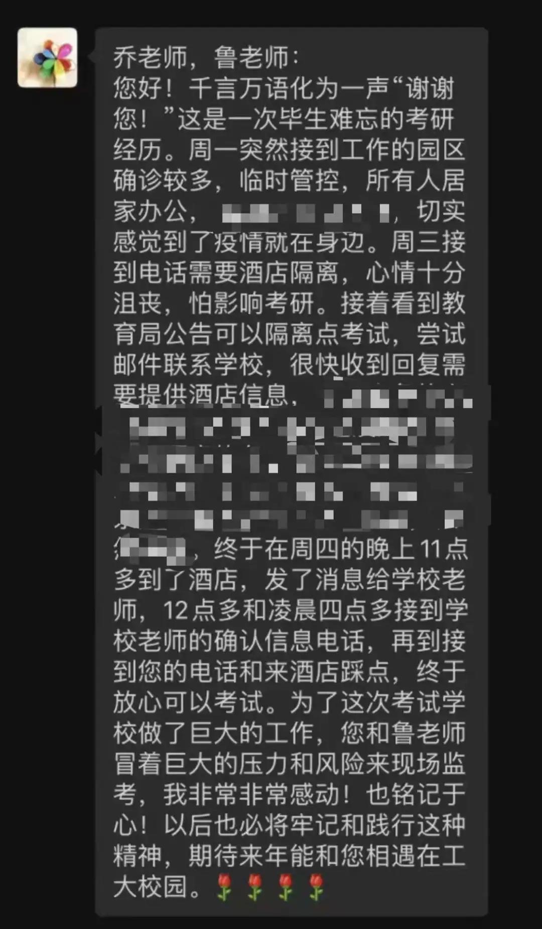 乔彩燕说:“当拉着行李箱走进酒店,我们就已做好就地隔离的准备,总要有人逆行,任务艰巨而光荣。我们既是监考,也是陪考,陪伴这批特殊的考生共克时艰是我们的使命。高校的根本任务是育人,学校对这次考研的细致安排就是最好的教育,当考生小杨考完临走时给我们深深鞠了一躬,当收到她真挚的感谢信息,我们感到所有的付出都值得。还有一大批奋战在一线的同事们为这次特殊的考研默默付出,我以他们为荣,我以西工大为荣。这两天下雪降温了,但这个飞雪的冬日很温暖。”