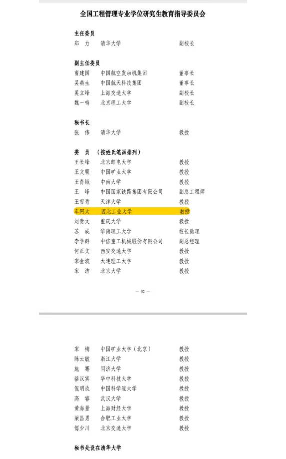 根据2021年12月27日国务院学位委员会、教育部、人力资源社会保障部印发的《关于全国金融等30个专业学位研究生教育指导委员会换届的通知》,西北工业大学车阿大教授当选新一届全国工程管理专业学位研究生教育指导委员会委员。