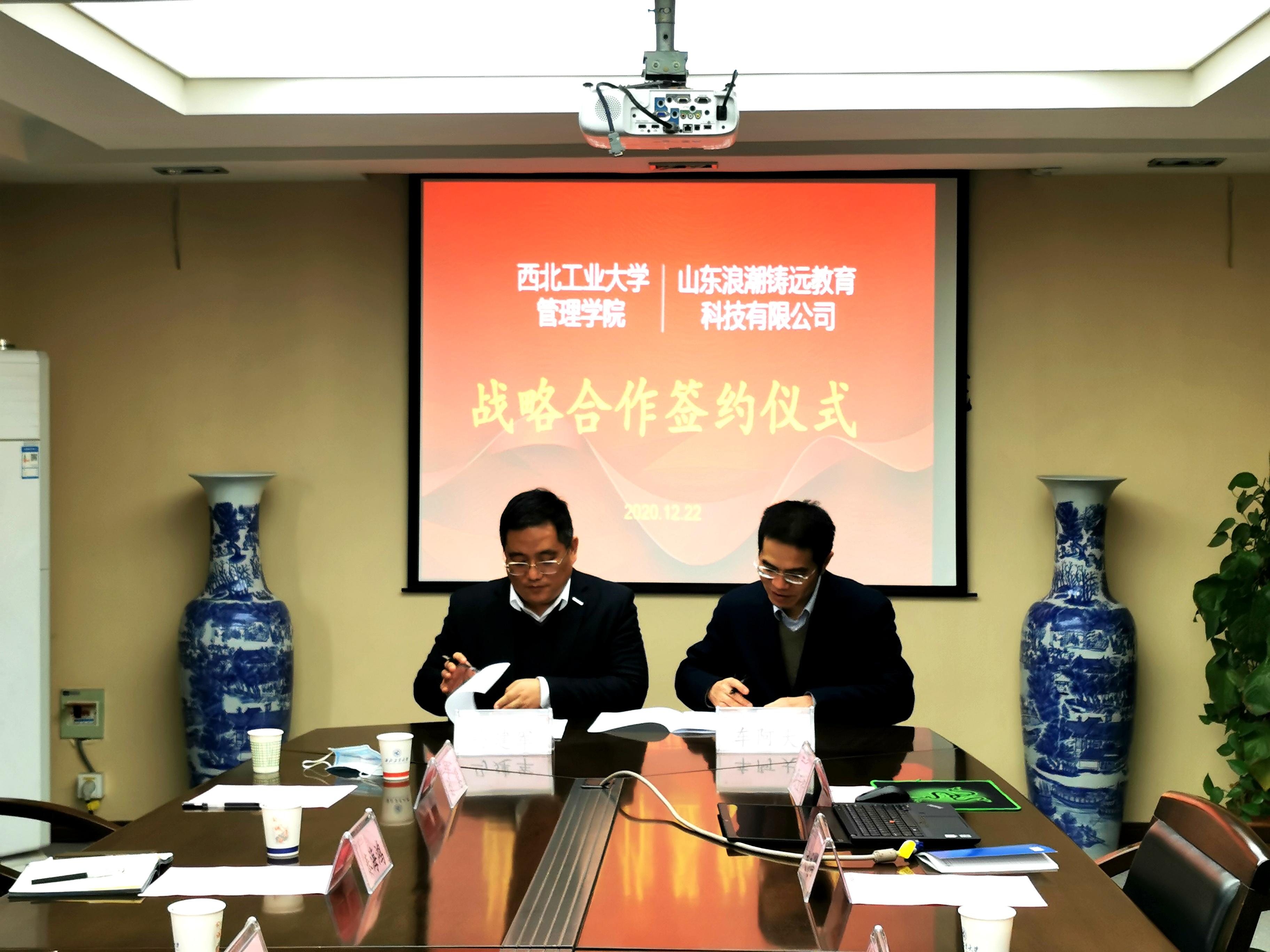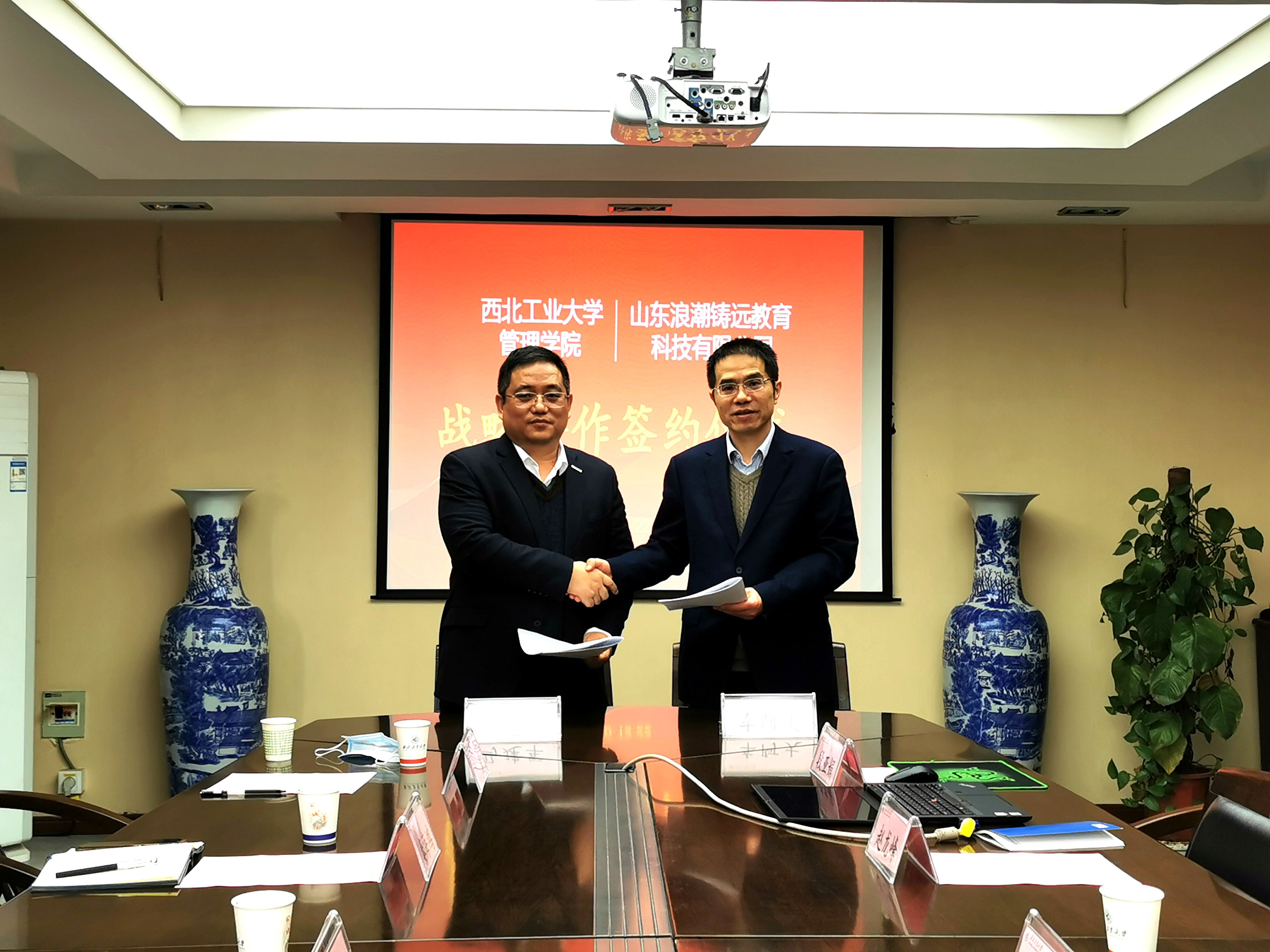车阿大院长首先对浪潮铸远公司马建军总裁一行表示热烈欢迎,然后向来访客人介绍了管理学院的发展历程及目前管理学科的发展现状;马建军总裁以切身经历介绍了自己从事大数据教育事业的体会,表达了对浪潮铸远公司与西工大管理学院开展战略合作的良好预期。双方一致认为,通过建立战略合作,共建产教深度融合发展平台,可以充分发挥双方优势资源的协同效应,探索数字时代新的育人模式,为国家建设培养优秀人才。随后,车阿大院长与马建军总裁共同签订了双方共建产教深度融合发展平台战略合作协议。