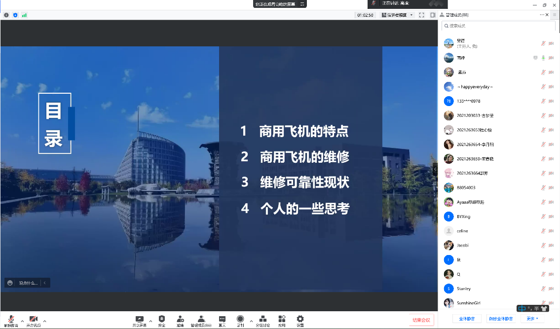 报告分享结束后,高峰老师和线上师生就民用飞机维修存在的痛点问题、可靠性等未来进一步可研究的方向进行了深入交流。最后,吴蓓副教授对本次学术交流进行了简单总结。本次报告会为我院师生提供了一次重要的学习交流机会,为我院多个专业的师生提供了航空领域实践方面的视角,拓宽了研究思路。