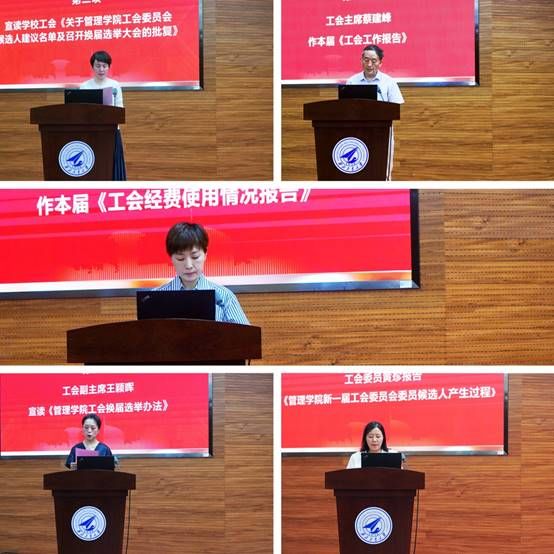 大会在庄严的国歌声中拉开序幕。乔彩燕宣读了学校工会《关于管理学院工会委员会候选人建议名单及召开换届选举大会的批复》,工会主席蔡建峰同志代表管理学院上一届工会委员会作工作报告,副主席翟润同志作工会财务报告,副主席王颖晖宣读《管理学院工会选举办法》,大会审议并通过了选举工作监票人、计票人名单,工会委员黄珍报告《管理学院新一届工会委员会委员候选人产生过程》并逐一对候选人基本情况进行介绍。随后,大会按照法定程序,以无记名投票方式差额选举产生了王颖晖、李纪柳、黄珍、蔡建峰、翟润新一届工会委员。