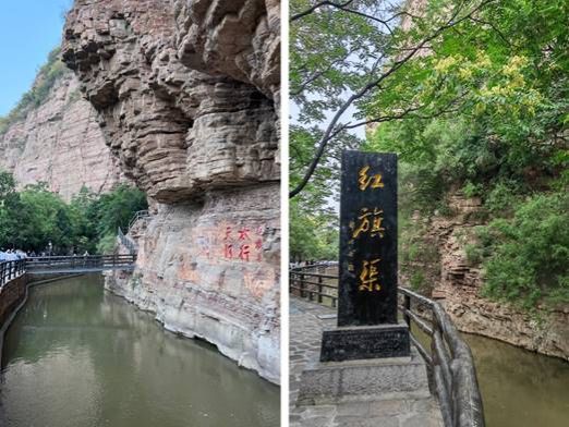 攀上台阶,走过“虎口崖”“水长城”,来到红旗渠修建过程中难度最高、危险最大的咽喉工程——青年洞。在如雄鹰耸立崖边的洞口旁,大家纷纷惊叹300名青年以愚公移山的精神,在没有任何机械辅助下,全靠最简单原始的人工凿洞最终胜利完工的伟大壮举。
