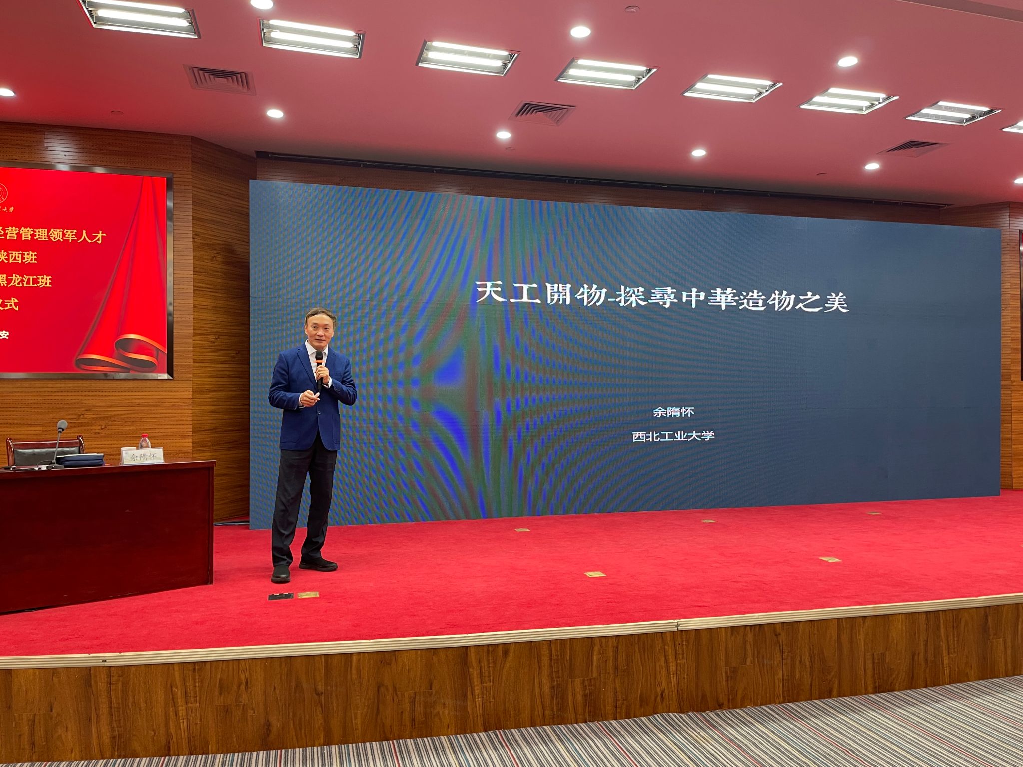 开班/结业仪式结束后,特邀西北工业大学教授、博士生导师,中国工业设计协会副会长,教育部工业设计专业教学指导分委员会副主任余隋怀做专家报告:《天工开物-探寻中华造物之美》。之后,组织参访了西北工业大学国家大学科技园和隆基绿能科技股份有限公司,聆听《双碳战略指引下的隆基光伏引领之路》报告。