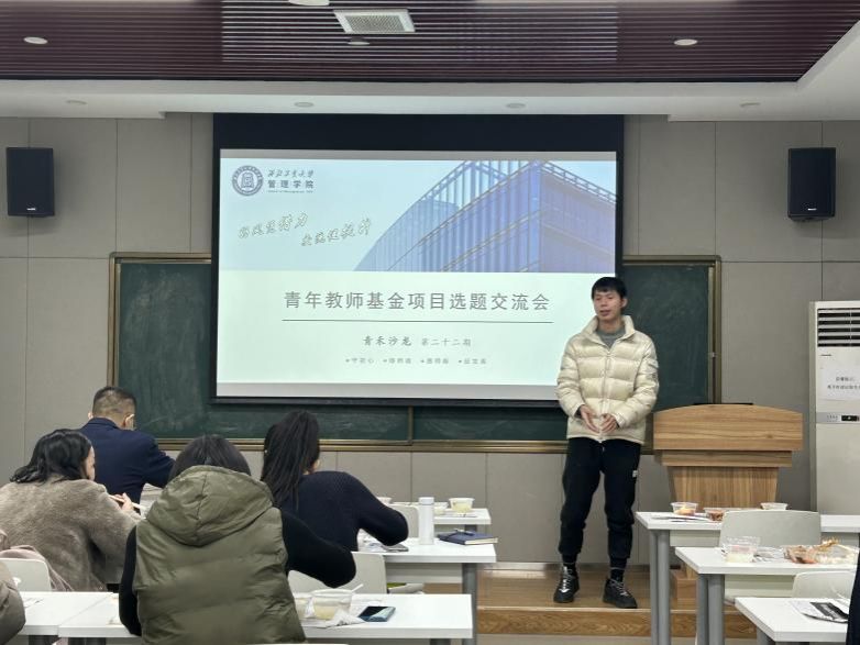 交流会上,六位青年教师相继分享了自己目前关于国家基金项目选题的思路和想法。管理科学与工程系傅陈翼计划基于博士阶段的研究成果进一步挖掘共享单车相关选题;市场营销系李恒宇介绍了关于直播电商渠道策略方面的选题设想;工商管理系郭利敏分享了她在智能化背景下发现的人力资源新问题;会计系田皓文从供应链共同所有权的视角出发讲解了其初步构想;会计系刘慧剖析了去年申报中存在的问题并对其申报方向进行了梳理;会计系黄珍汇报了对公司融资成本研究的新思路。