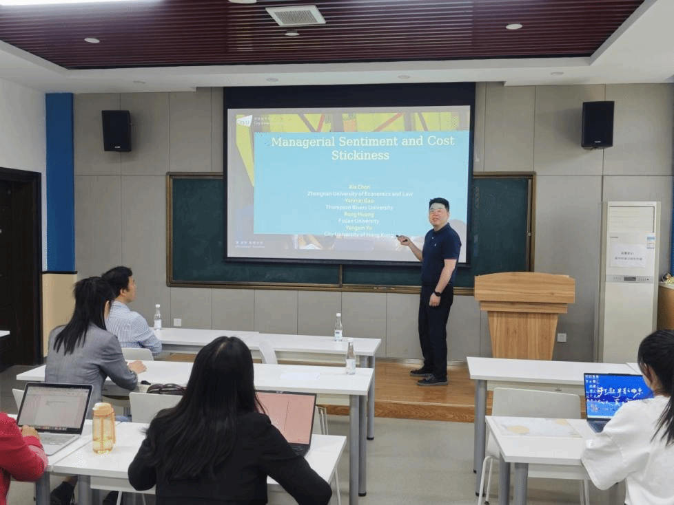2024年4月25日上午,应管理学院邀请,香港城市大学商学院会计系余扬新教授在学院214教室作了题为“Managerial Sentiment on Firms’ cost Stickiness”的学术报告会,讲座由会计系教师封华主持,学院30余位同学和会计系、工商系10位老师参加。