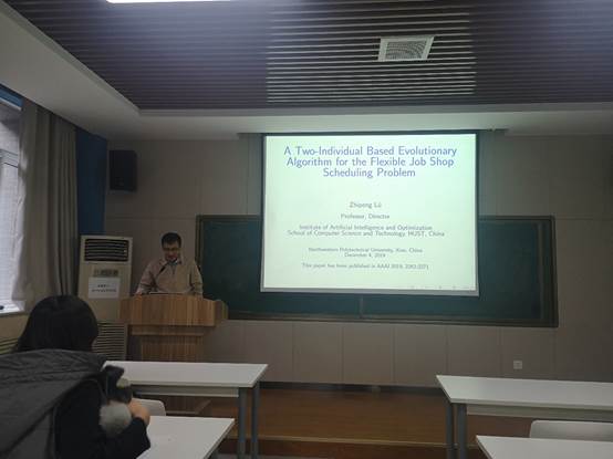 2019年12月4日下午,应管理学院邀请,华中科技大学计算机学院吕志鹏教授在长安校区管理学院210教室做了题为“求解柔性作业车间调度问题的师徒进化算法”的学术报告。本次报告会由王阳副教授主持,学院部分师生参加了此次报告会。