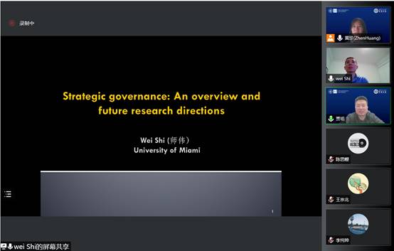2021年12月22日晚上20:00,应管理学院邀请,迈阿密大学迈阿密赫伯特商学院Wei Shi副教授通过腾讯会议平台针对“战略治理:综述与未来研究方向(Strategic governance: An overview and future research directions)”进行了学术报告。本次学术报告邀请了西北工业大学管理学院副院长、新时代企业高质量发展研究中心主任贾明教授参会,并在学术报告前对Wei Shi副教授进行了简要介绍。本次学术报告由黄珍老师主持,本校师生等共百余人在线参与了此次学术报告。