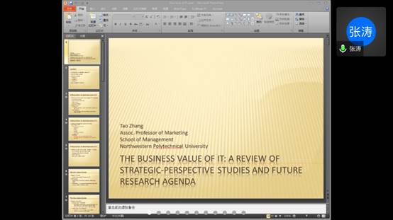 4月23日下午,管理学院举行了《管理理论专题》系列报告第七讲。张涛副教授通过腾讯会议平台做了主题为“信息技术的商业价值:基于战略视角的研究回顾与未来研究方向”的报告。多位老师和修读博士生课程的博士生参与了本次线上学术讲座。