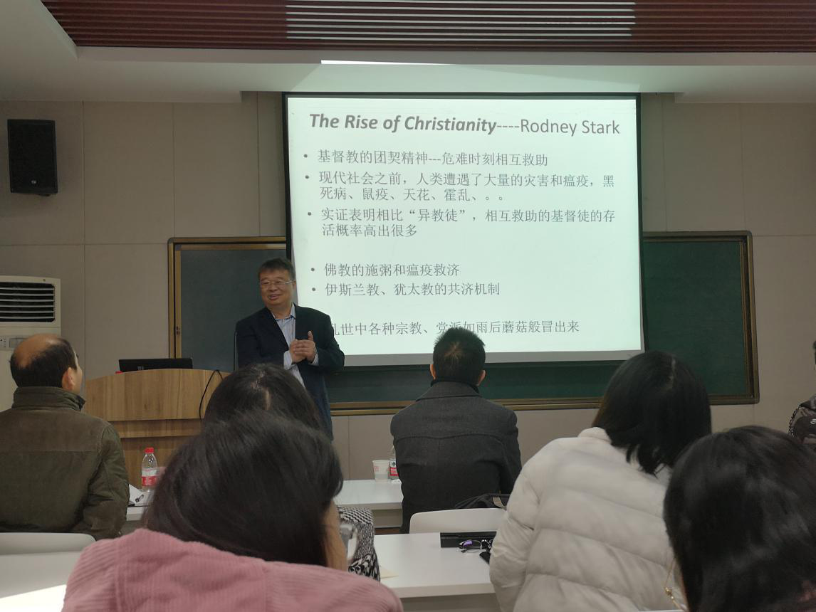 紧接着,杨老师针对模型,结合自己的观察,分别从正常时期和危机时期经济运行的特点以及政府采取的做法进行分析得出,政府应当在正常状况下维护自由竞争经济,危机状态下采取国家干预政策,由此引出了“生存还是发展的抉择”,并从生物学领域找出了相关理论支撑。最后,杨老师通过对古今中外 “从走出危机到恢复正常”的典型事例进行深入剖析,指出人类社会的运行是在不同状态下的循环反复,而社会治理方式的选择,应该顺应社会运行规律,并尽可能形成一套机制,以减少危机的发生。