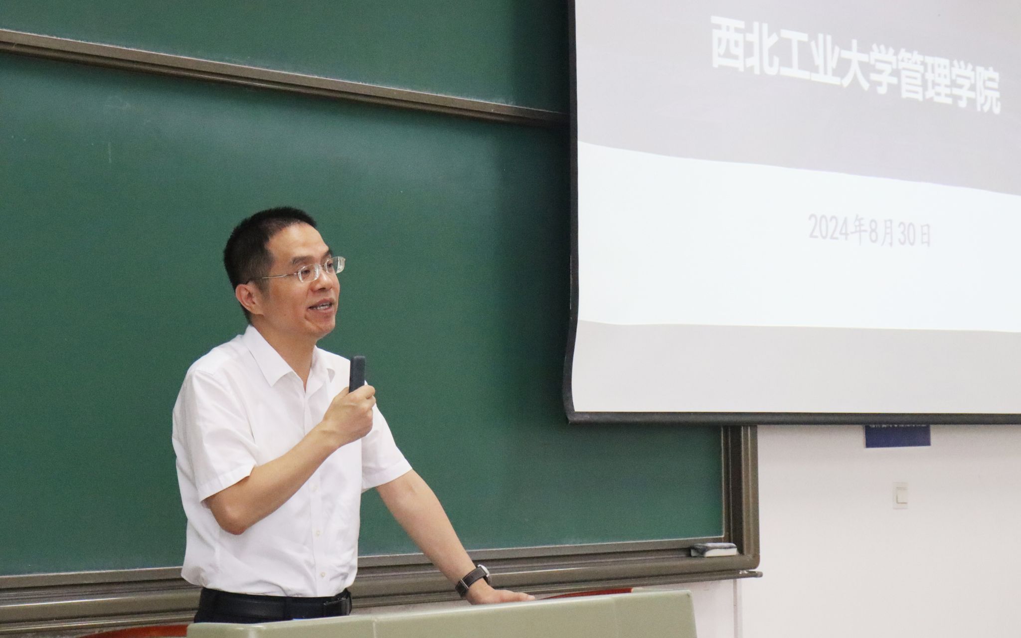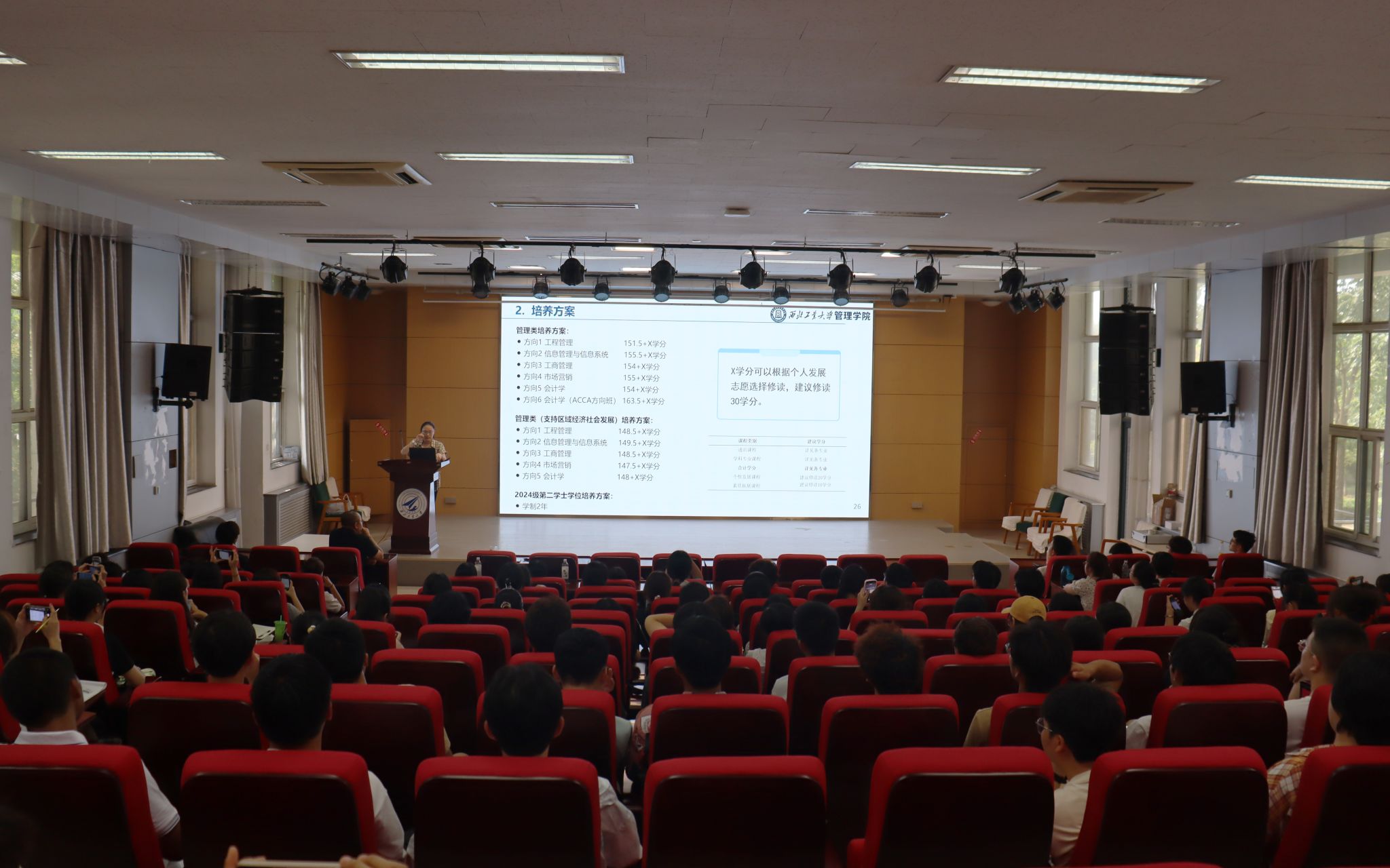 8月30日下午,管理学院在长安校区举行本科新生家长见面会,院长车阿大、党委副书记王海啸、六级职员白洁,全体新生班主任、辅导员、教学秘书、外事秘书,以及2024级本科生和家长近260人参加了见面会。车阿大详细介绍了学院的发展历程,着重强调了敬业、务实、开放、创新的学院价值观和本科生人才培养理念,并系统介绍了学院的学科专业、科学研究、师资队伍。王海啸介绍了学院学生工作和本科教学工作的具体情况,五位新生班主任依次向新生和家长们做了自我介绍,为新生们送上了殷切的期望与祝福。此次新生家长见面会为家长们提供了一个深入了解管理学院的机会,为后续深化家校协同育人打下了良好基础。