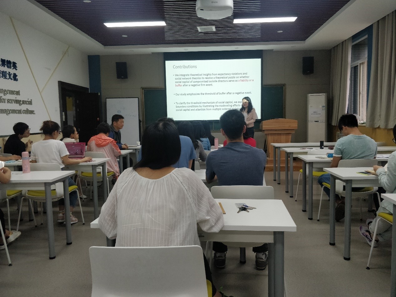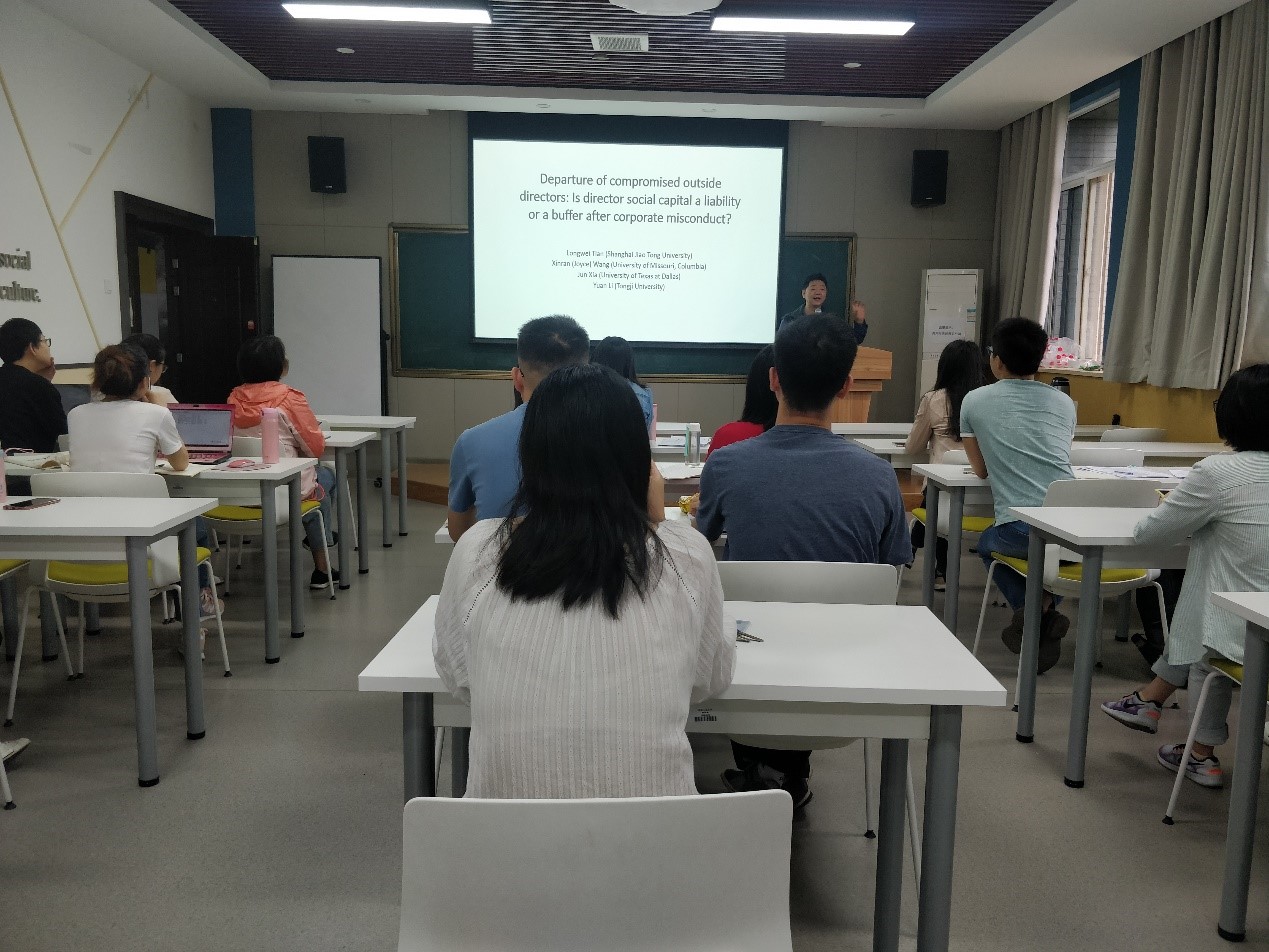 2019年6月21日,美国德克萨斯大学达拉斯分校夏军副教授在我院作了题为“DEPARTURE OF COMPROMISED OUTSIDE DIRECTORS: IS DIRECTOR SOCIAL CAPITAL A LIABILITY OR A BUFFER AFTER CORPORATE MISCONDUCTS?”的报告。报告会由管理学院张莹副教授主持,学院的研究生共20余人参加了此次报告会。